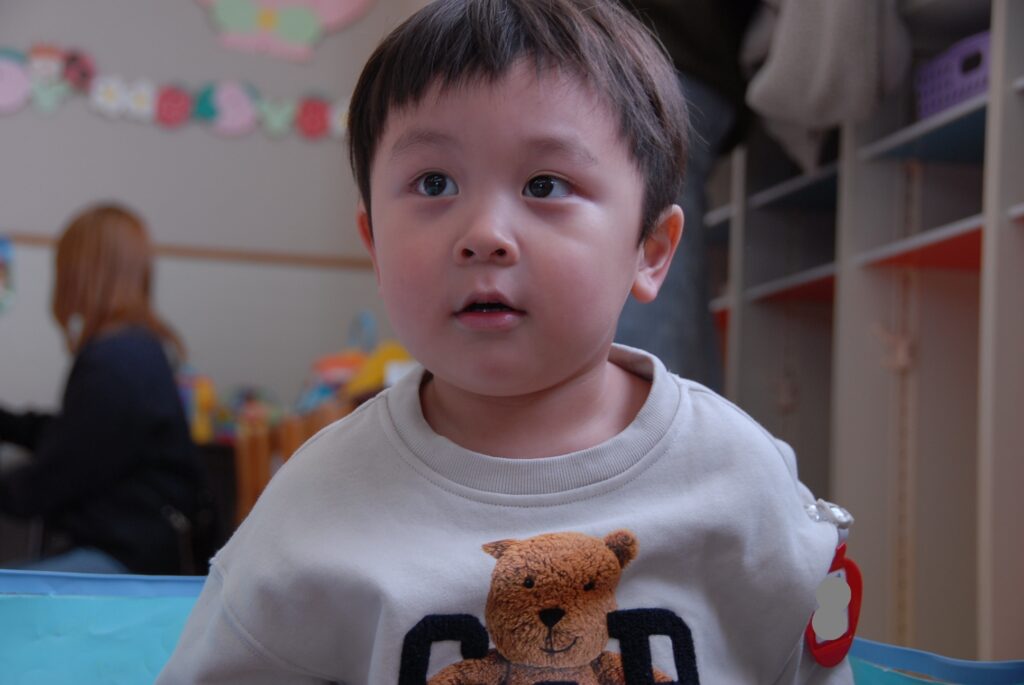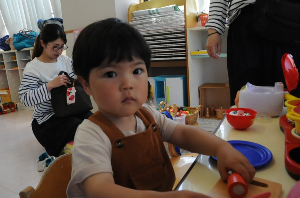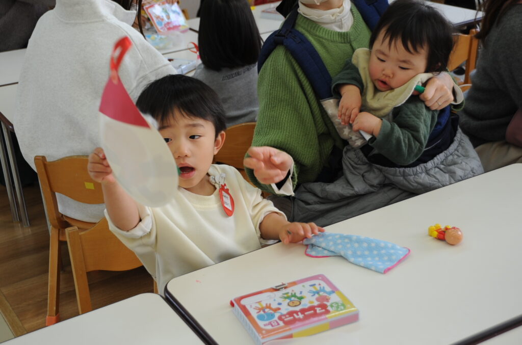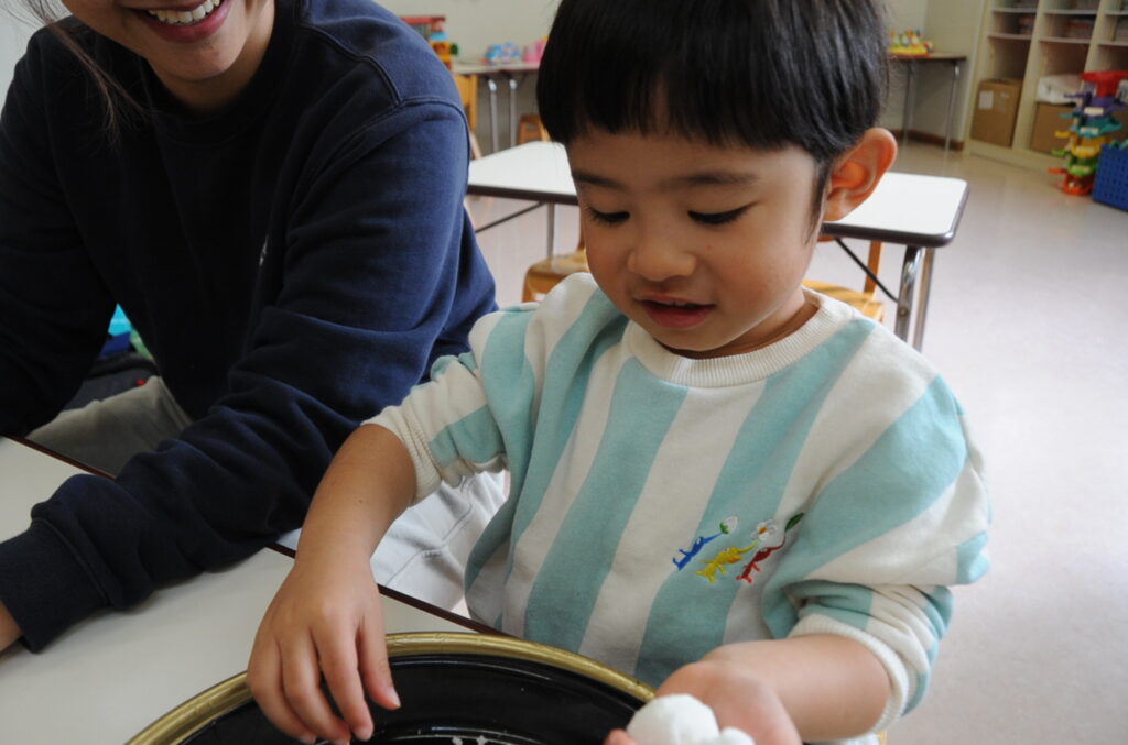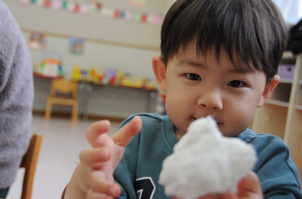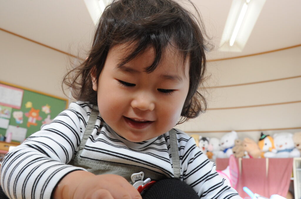 今日は、初めてはさみを使います。「紙きるんだよ、手はきっちゃだめ、だめ!」
