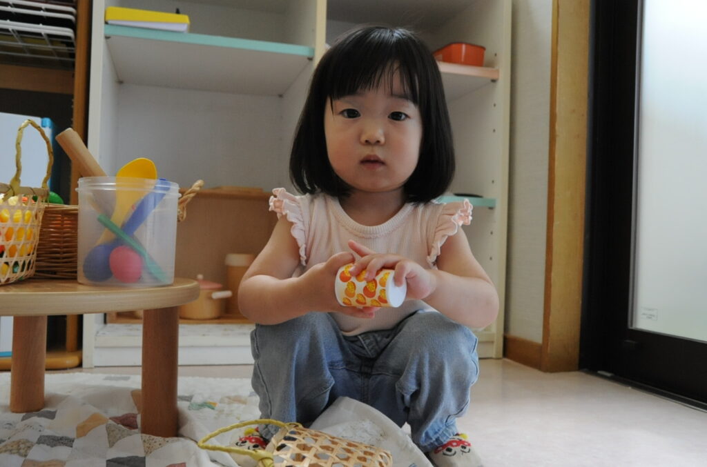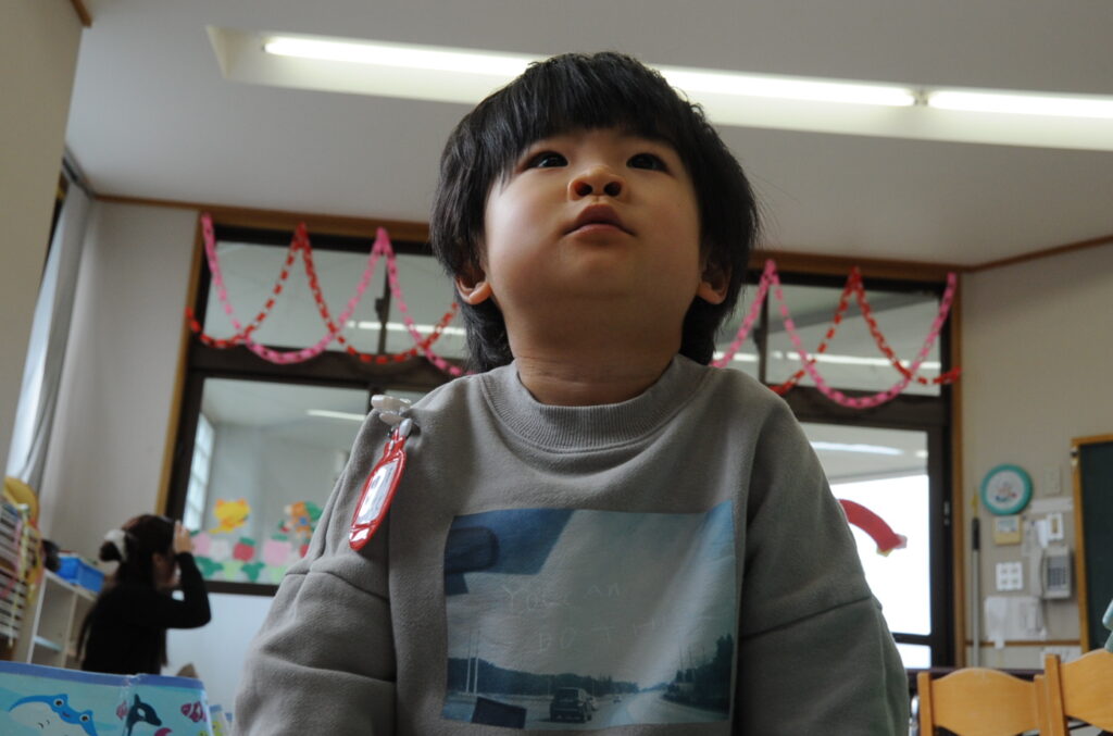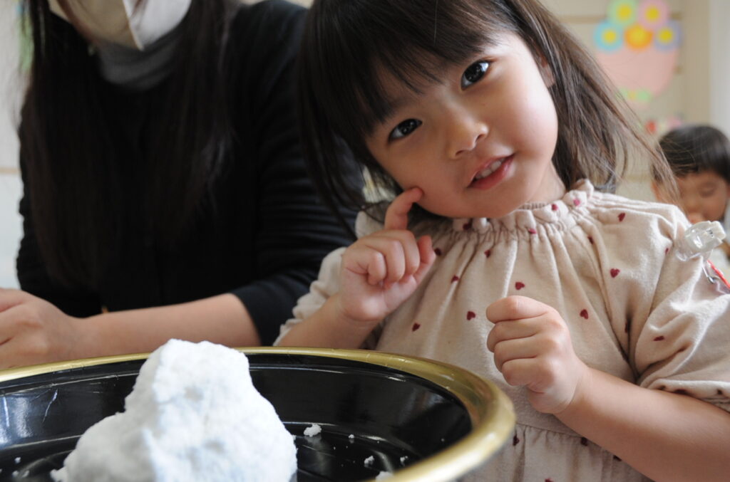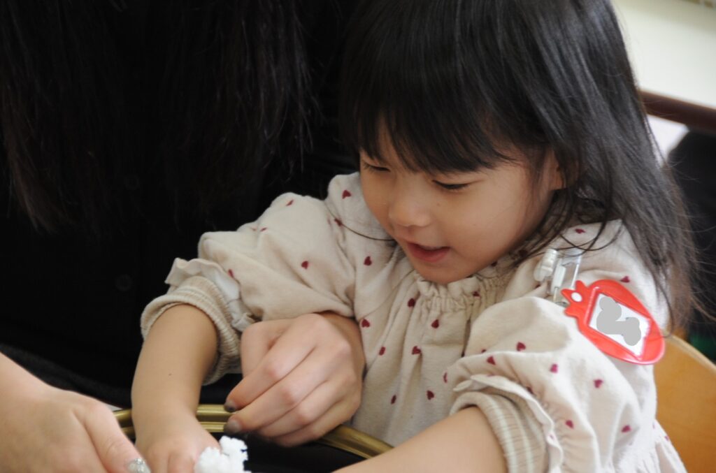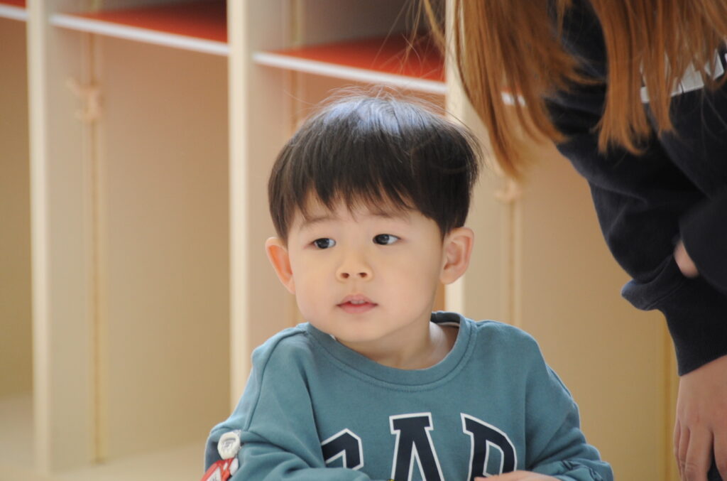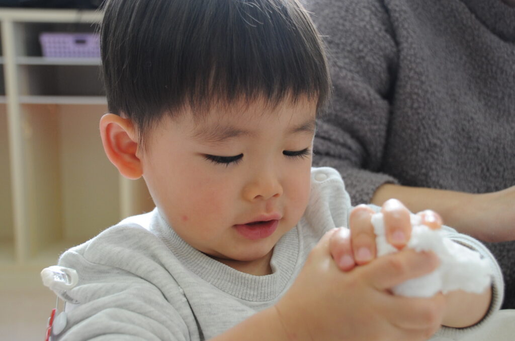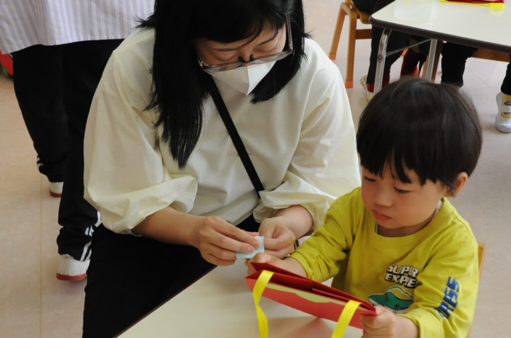 今日は、初めてはさみを使います。「紙きるんだよ、手はきっちゃだめ、だめ!」
