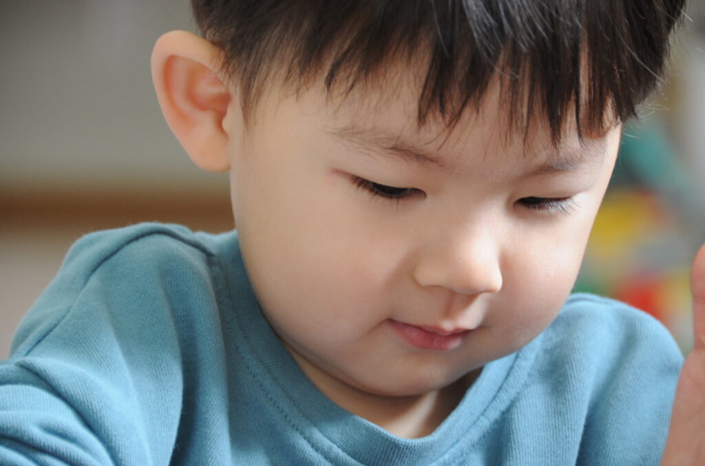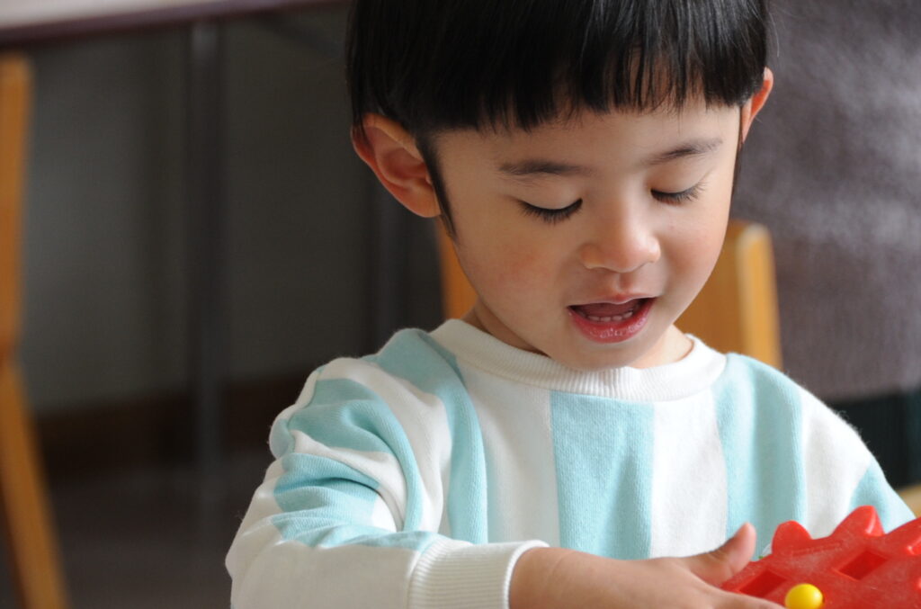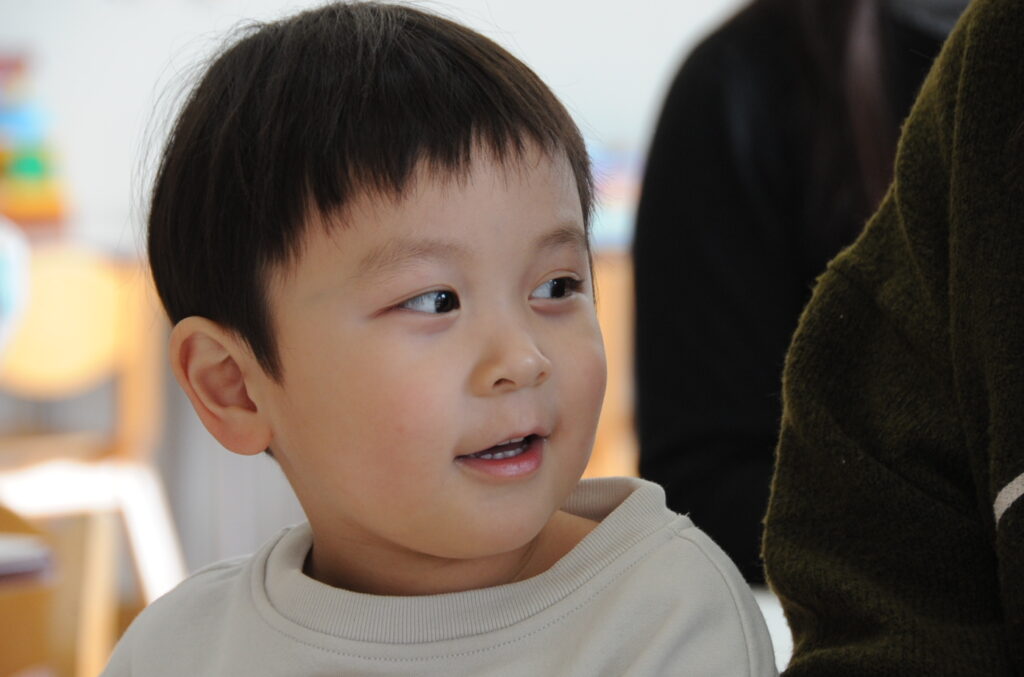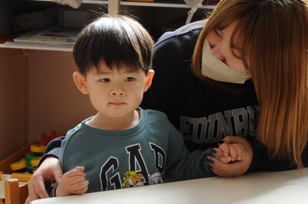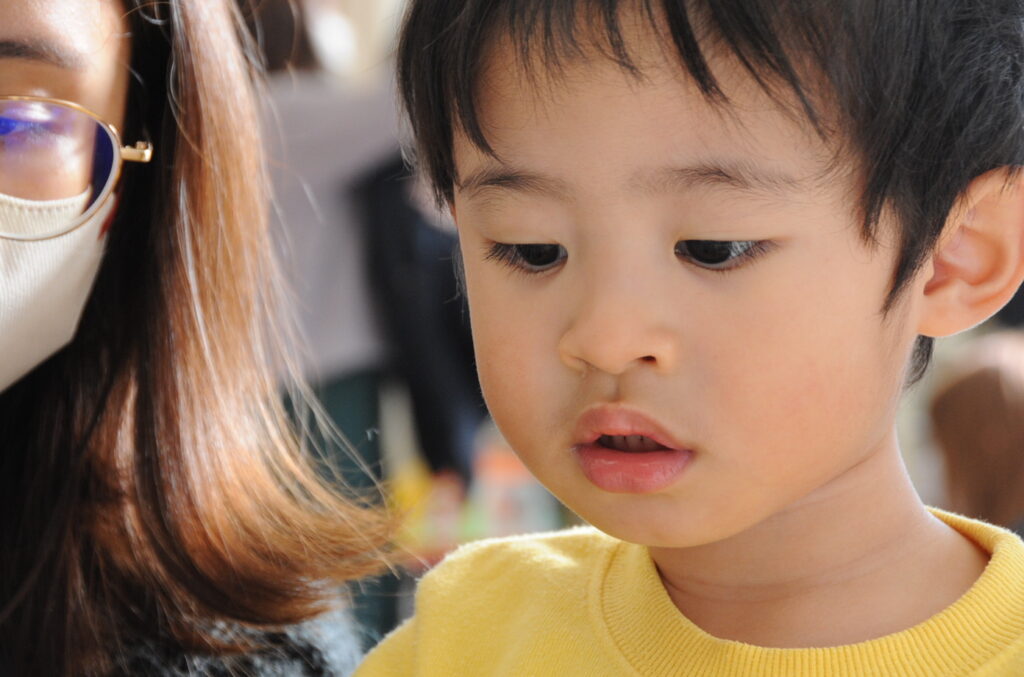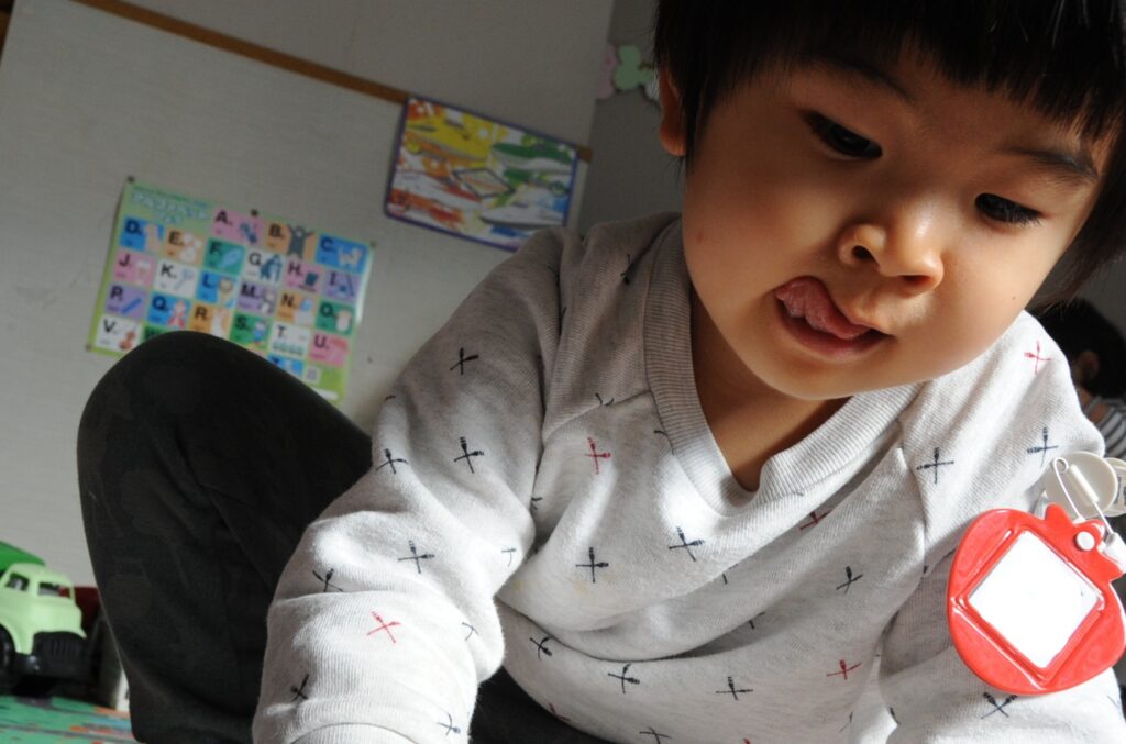 今日は、初めてはさみを使います。「紙きるんだよ、手はきっちゃだめ、だめ!」