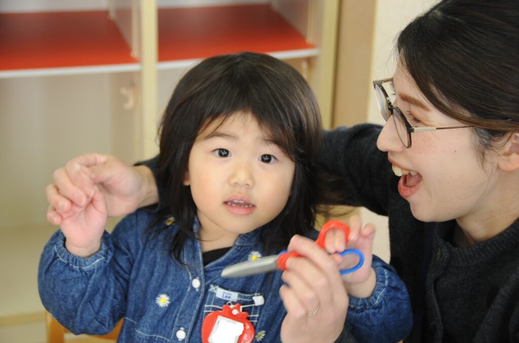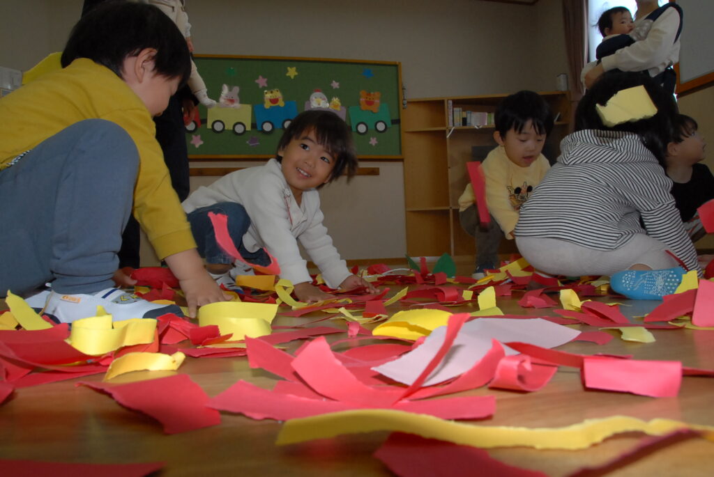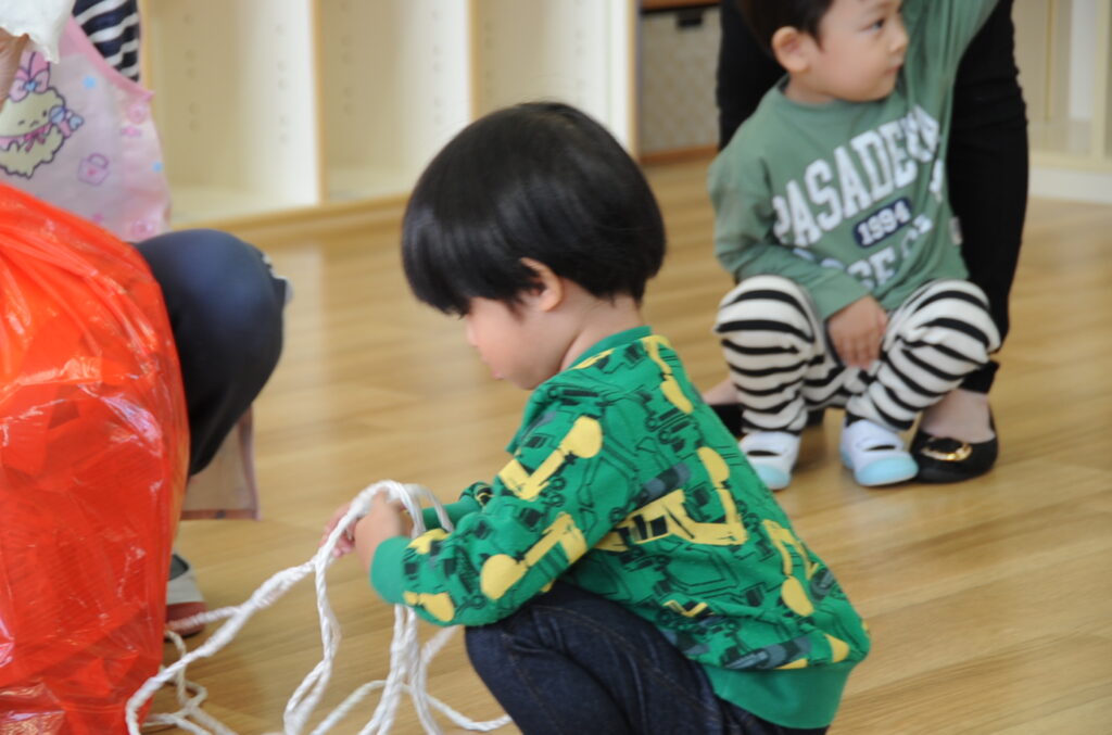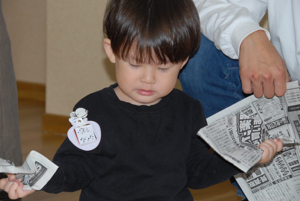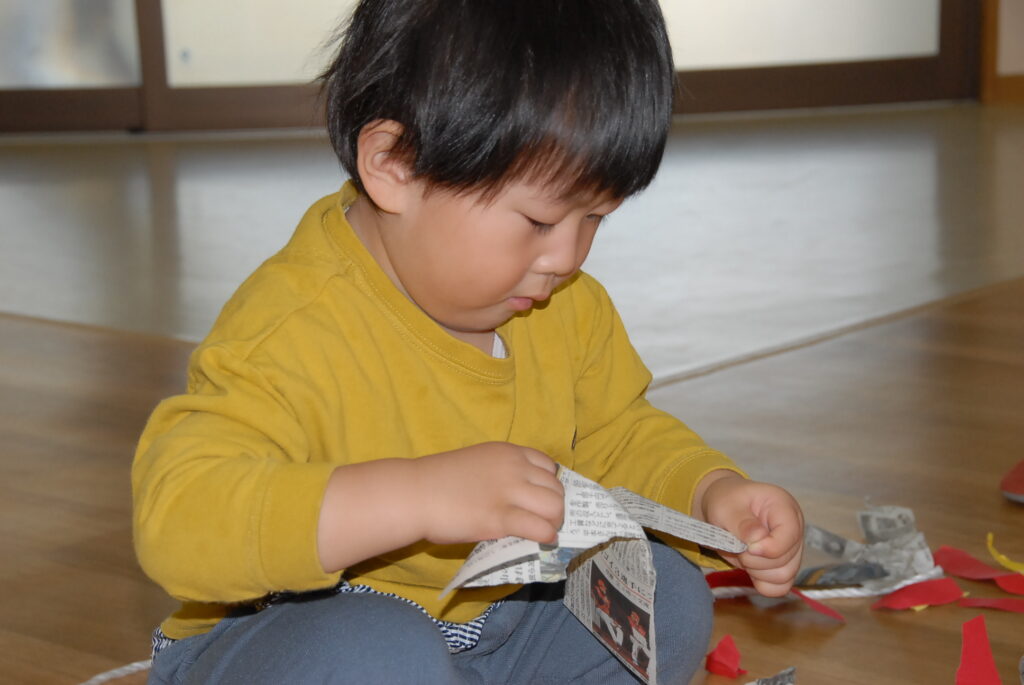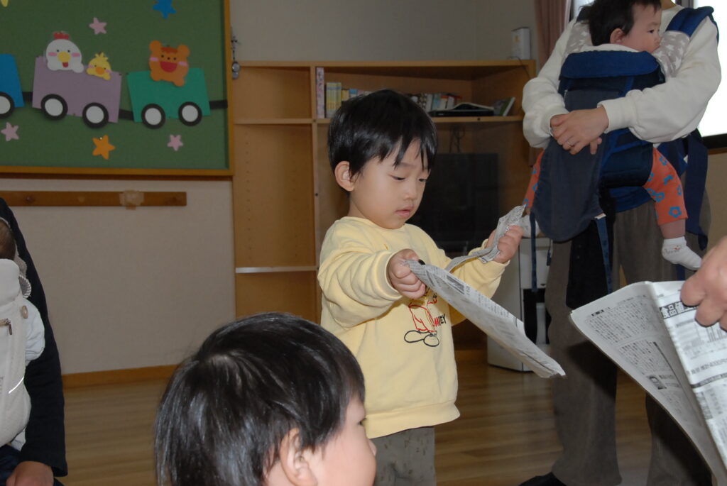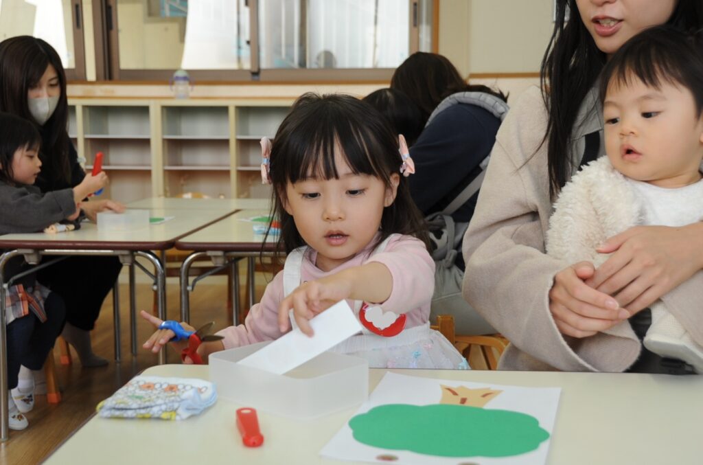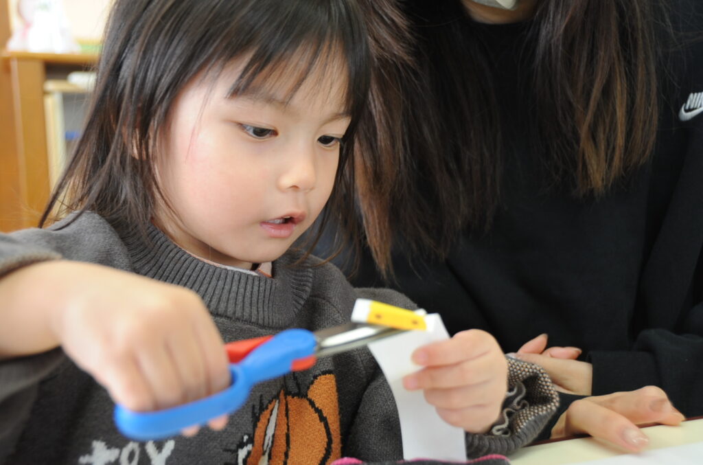 今日は、初めてはさみを使います。「紙きるんだよ、手はきっちゃだめ、だめ!」