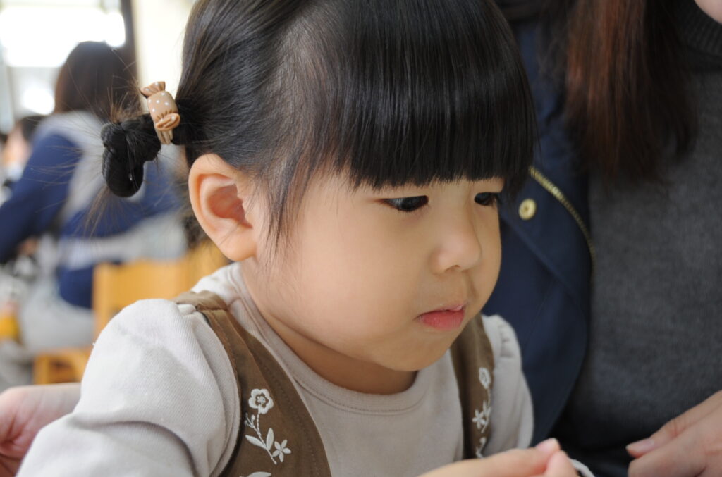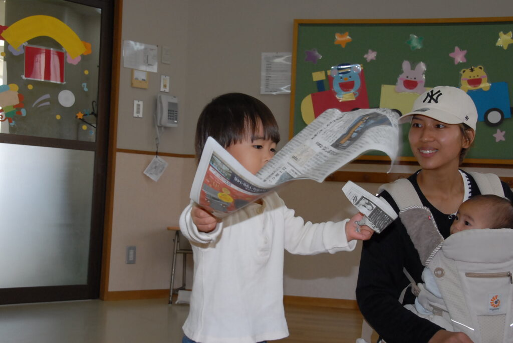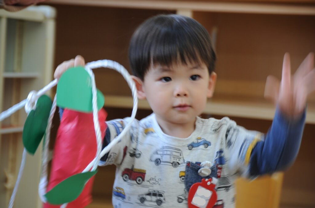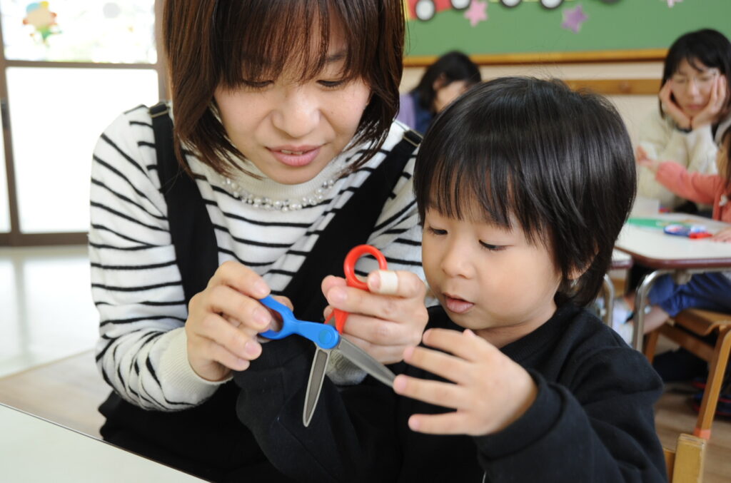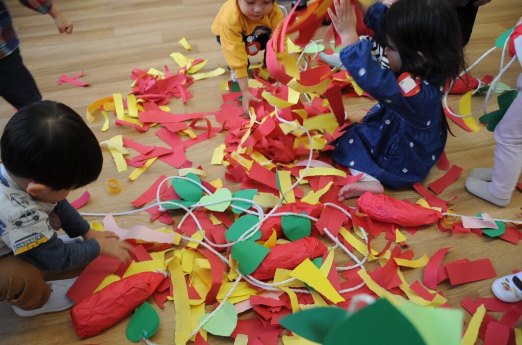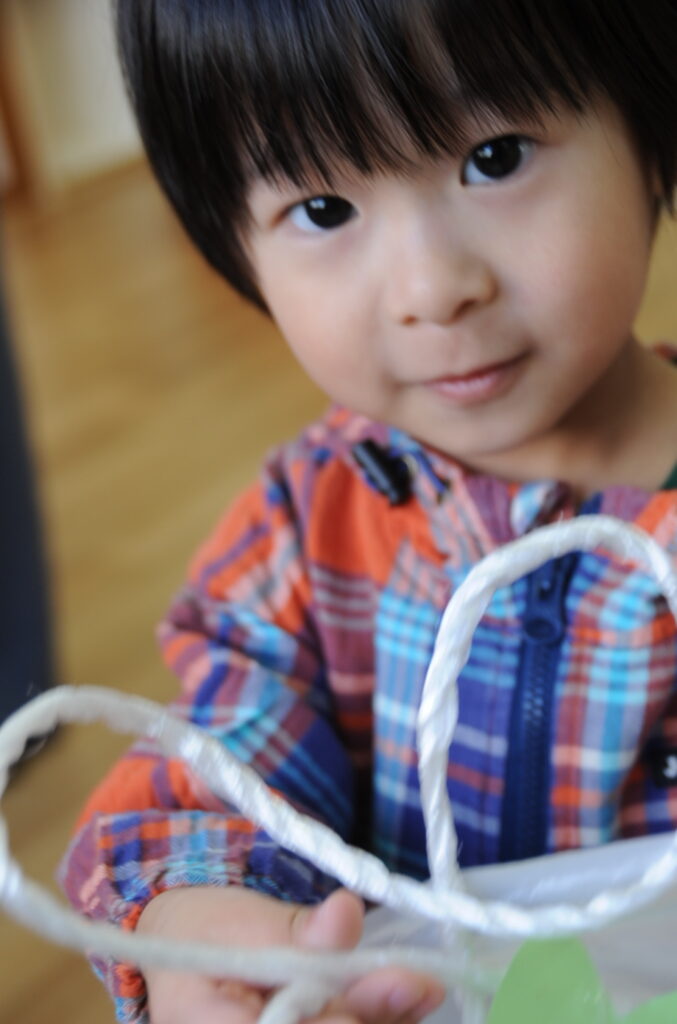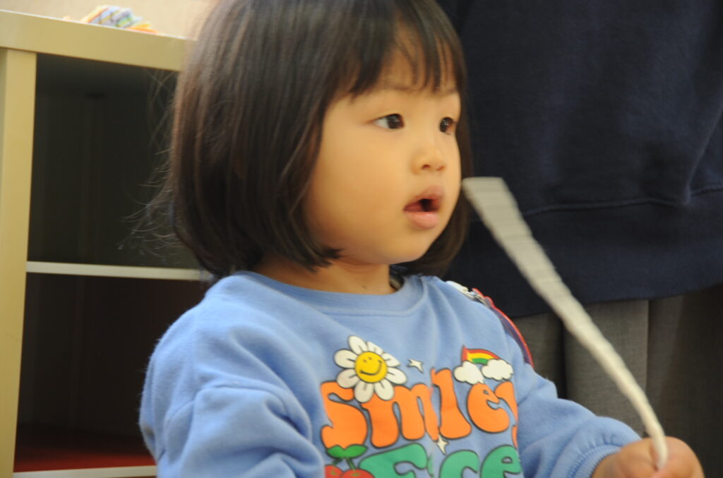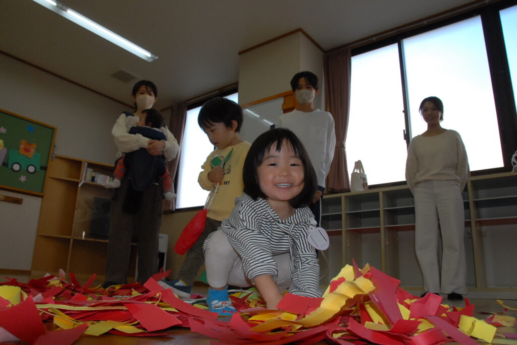 今日は、初めてはさみを使います。「紙きるんだよ、手はきっちゃだめ、だめ!」
