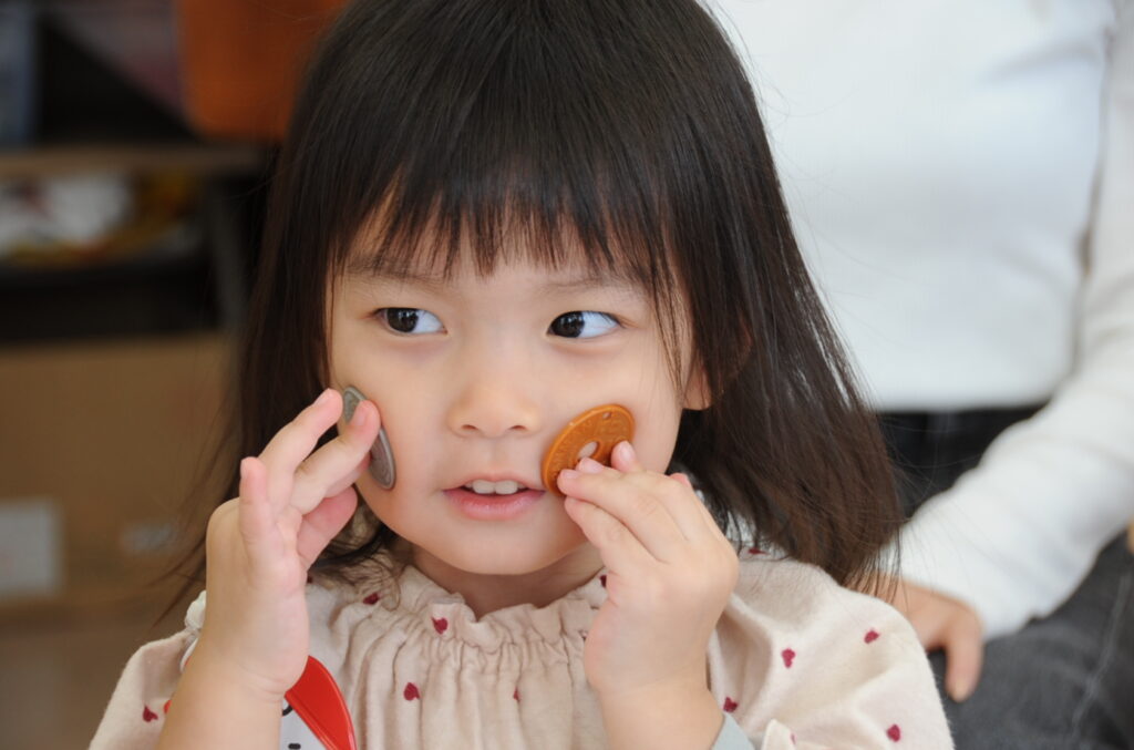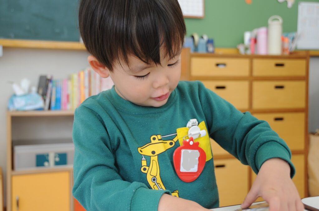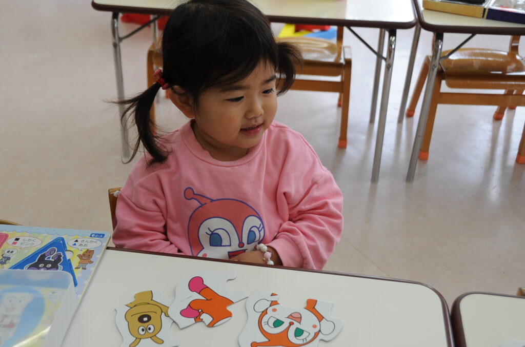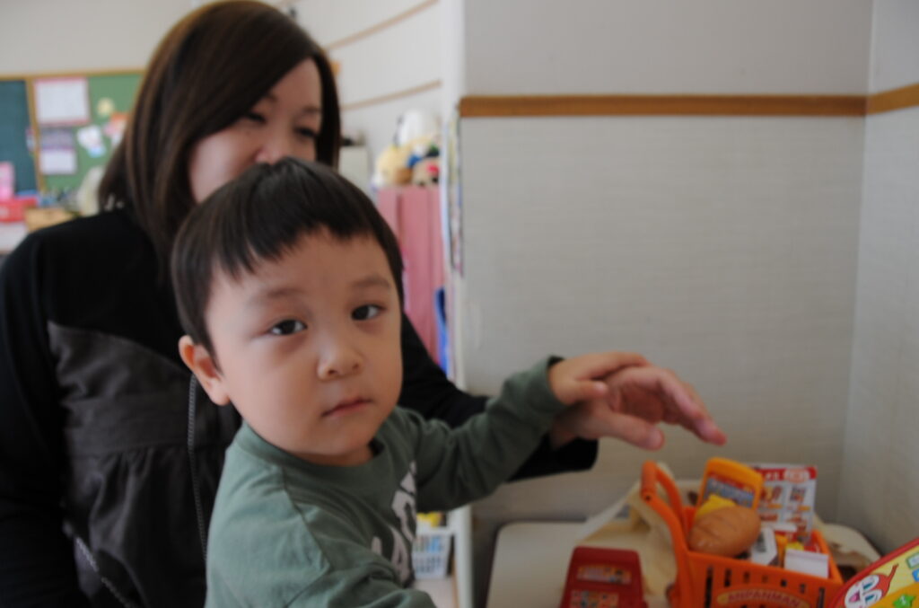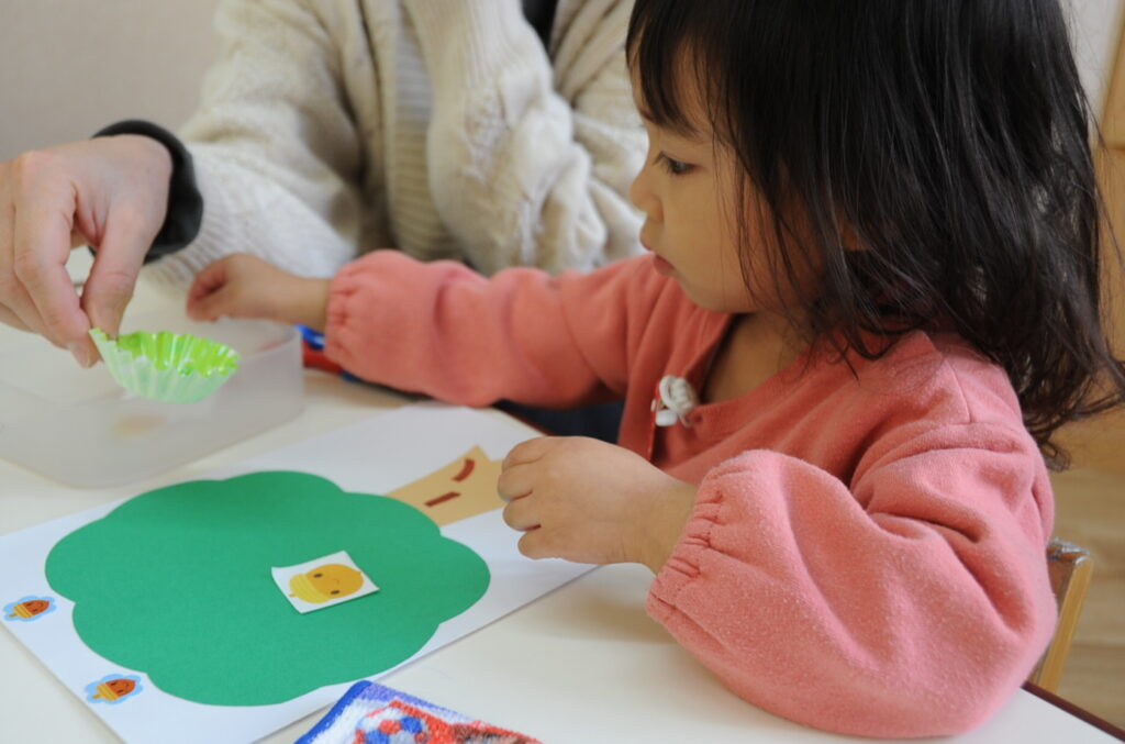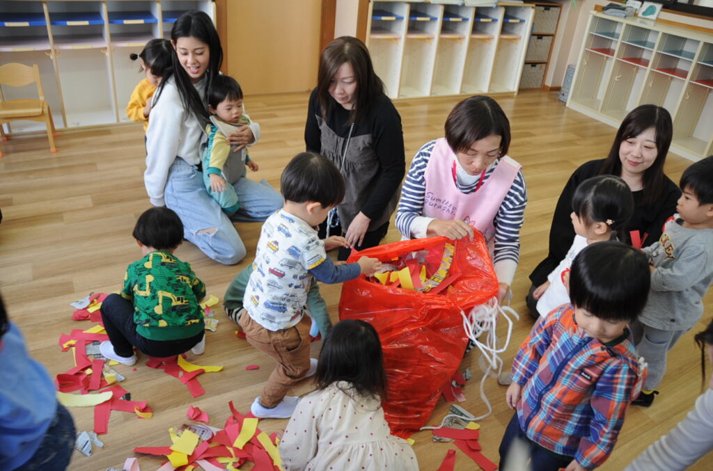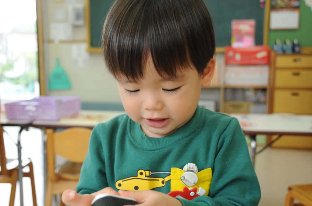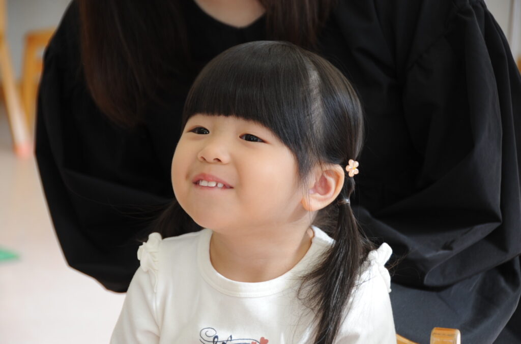 今日は、初めてはさみを使います。「紙きるんだよ、手はきっちゃだめ、だめ!」