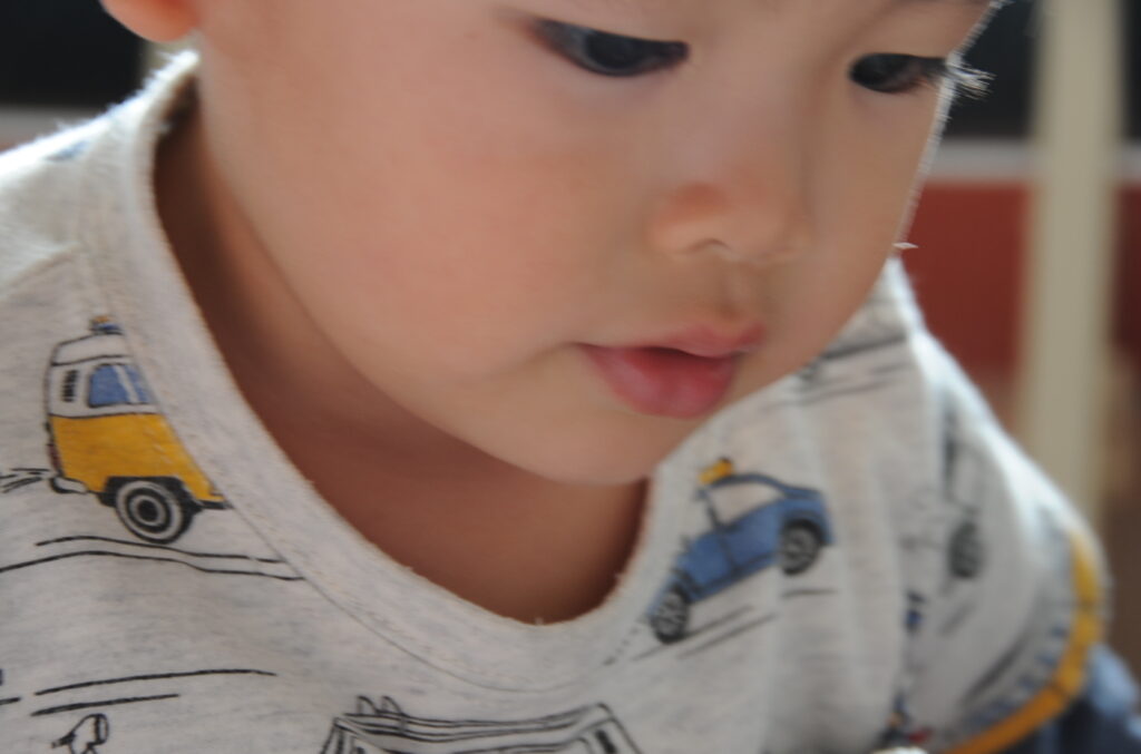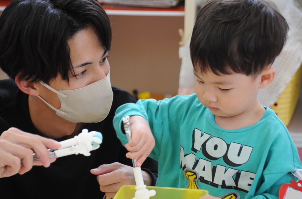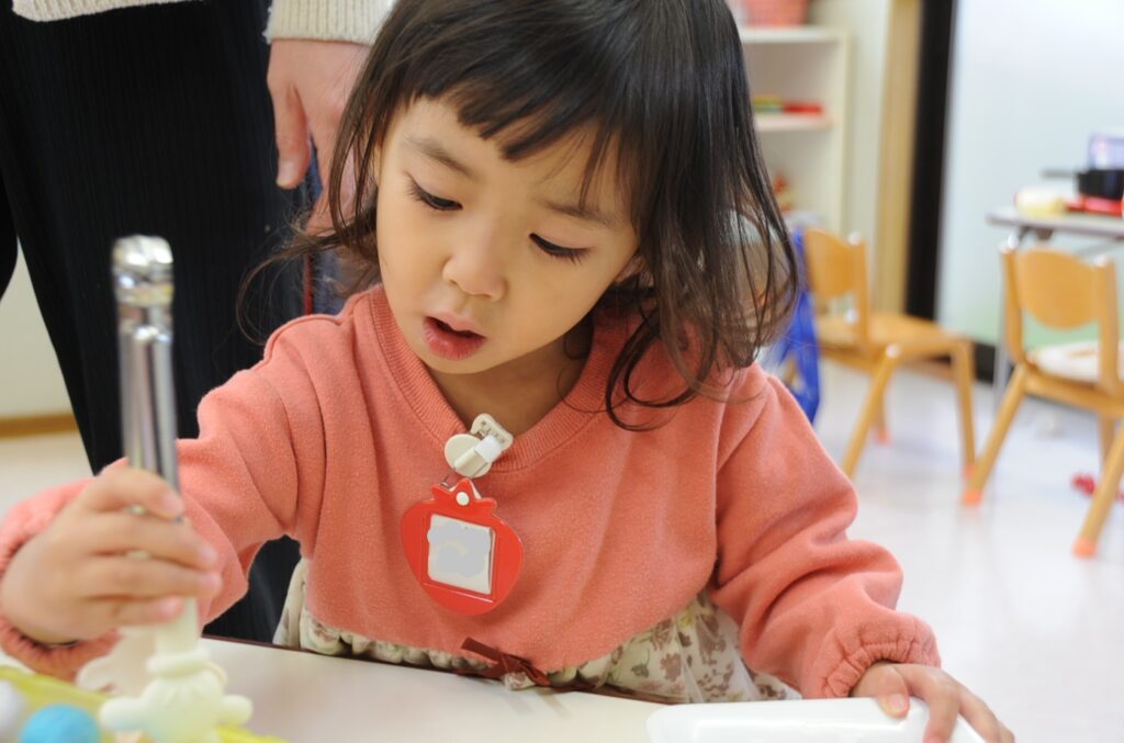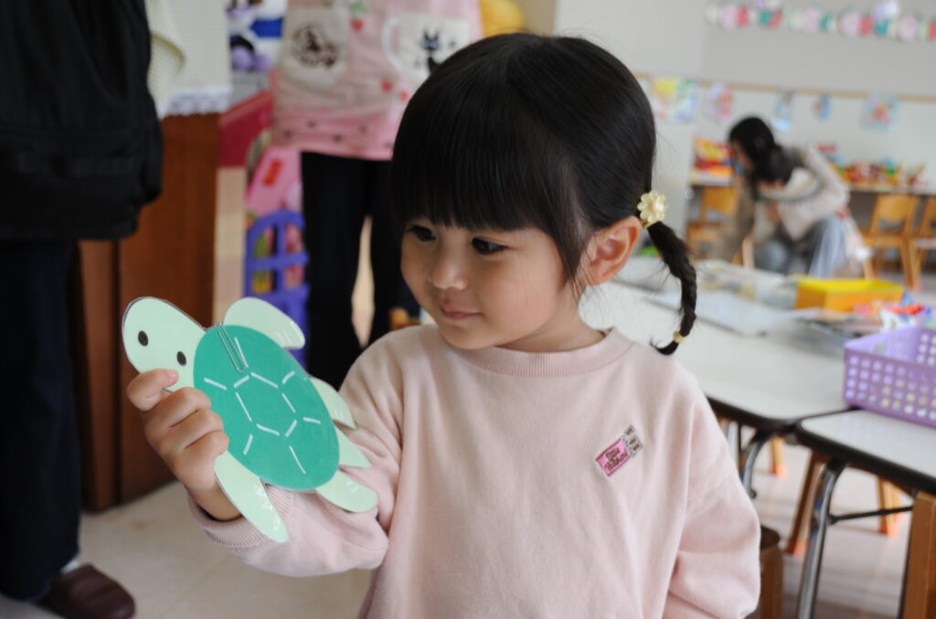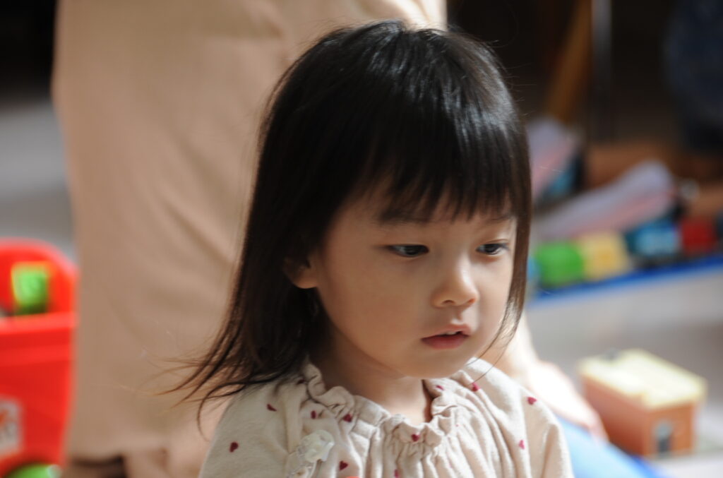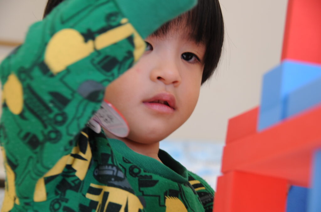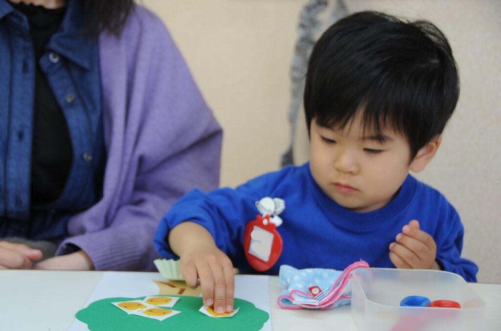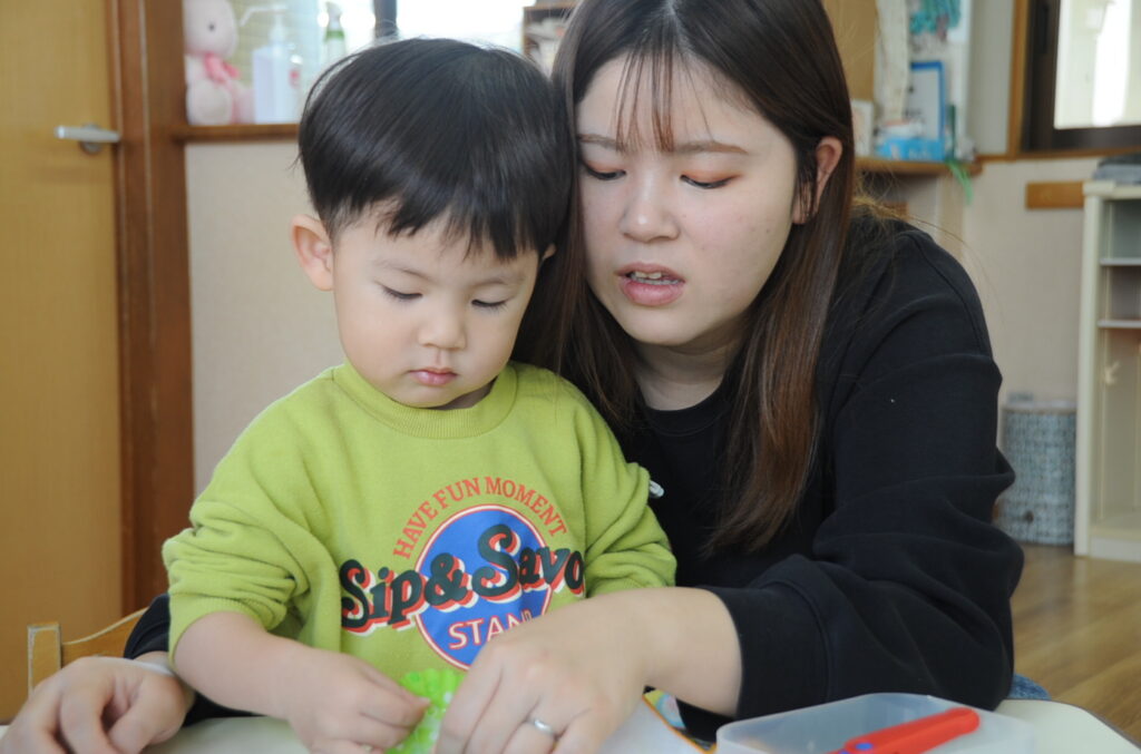 今日は、初めてはさみを使います。「紙きるんだよ、手はきっちゃだめ、だめ!」