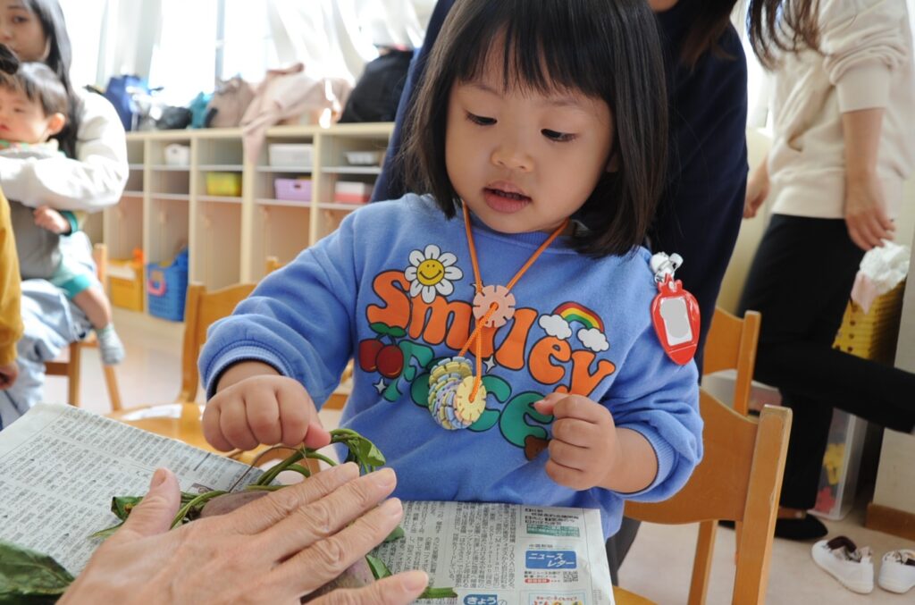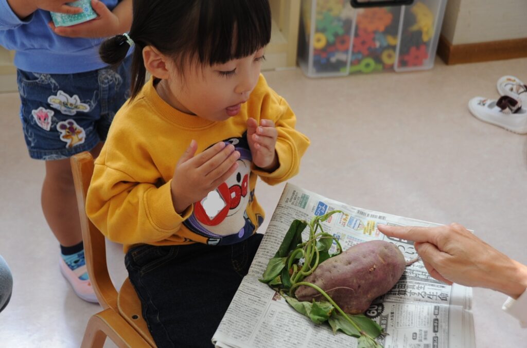 おいもほりごっこにいったよ!うんとこしょ、どっこいしょ!あかいおいもがとれたよ!