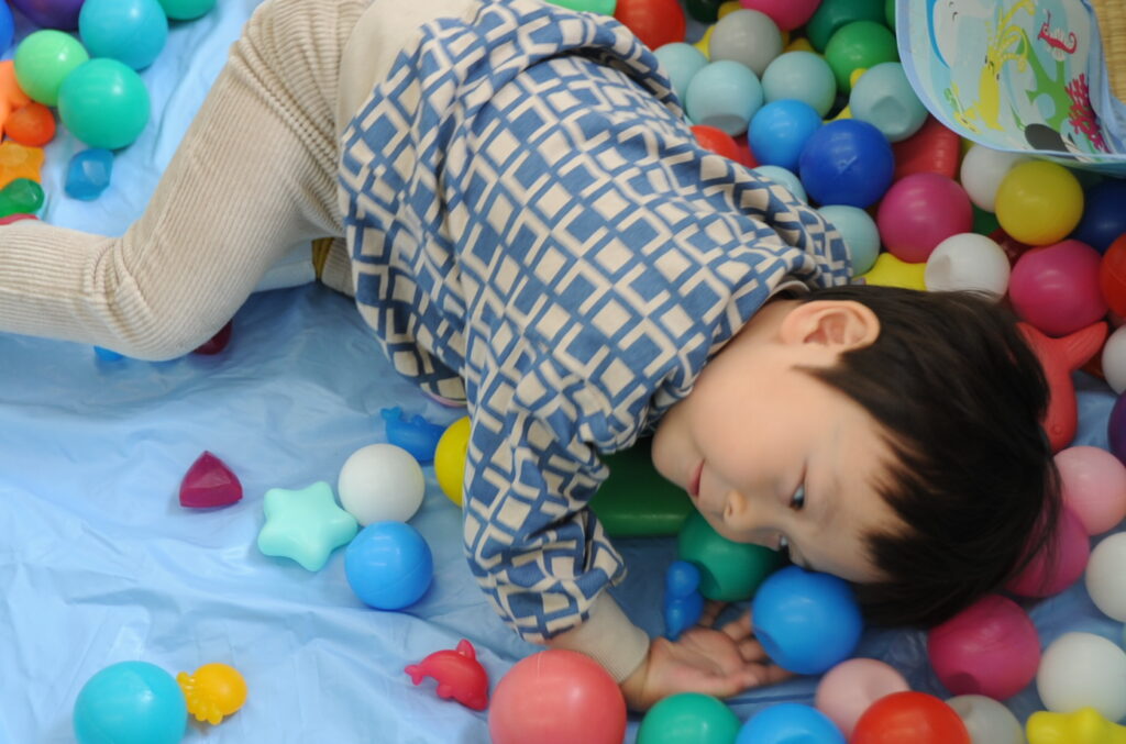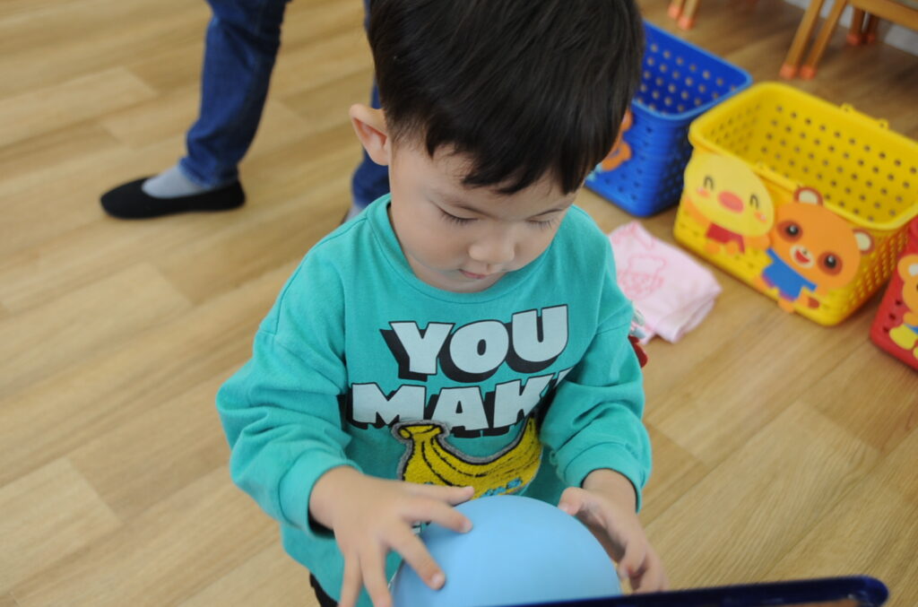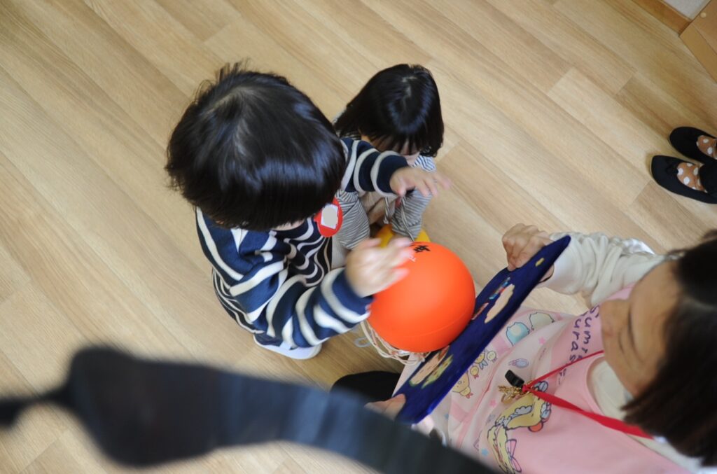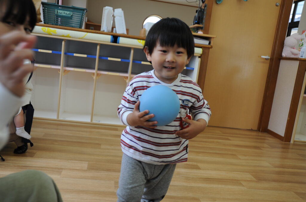 今日はボールを使って遊びますよぉ!まずは、ボール運びから!できるかな?