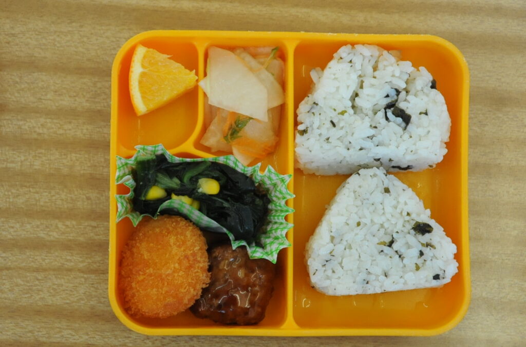 では、今日の給食の様子をお知らせします。なお、写真のコメントは、いつものように制作者の想像です!あしからず!!給食メニューは、照焼ソースハンバーグ、北海扇フライ、大根の和風サラダ、ほうれん草とコーンのソテー、わかめむすび、オレンジ です。それでは、今日もおいしく、「いただきまぁす!!」