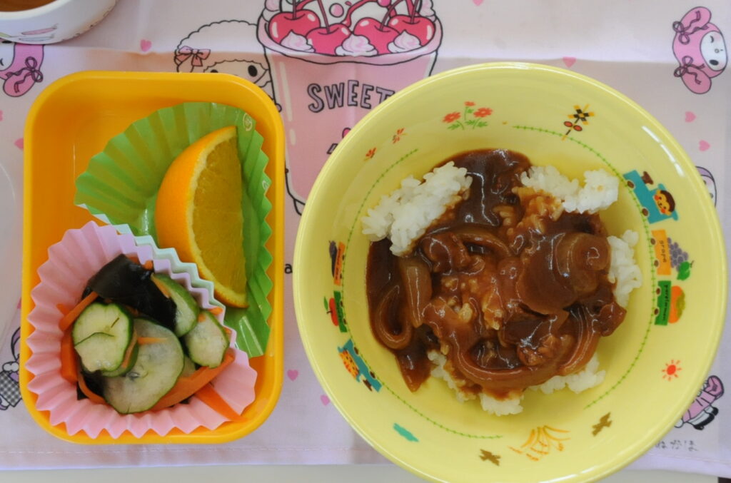 では、今日の給食の様子をお知らせします。なお、写真のコメントは、いつものように制作者の想像です!あしからず!!給食メニューは、ハヤシライス、胡瓜とワカメの青じそサラダ、オレンジ です。それでは、今日もおいしく、「いただきまぁす!!」