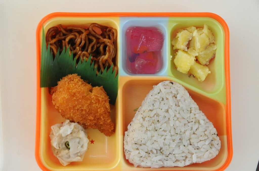では、今日の給食の様子をお知らせします。なお、写真のコメントは、いつものように制作者の想像です!あしからず!!給食メニューは、コーンクリームコロッケ、焼きそば、さつま芋サラダ、シューマイ、ぶどうゼリー、ゆかりむすび です。それでは、今日もおいしく、「いただきまぁす!!」