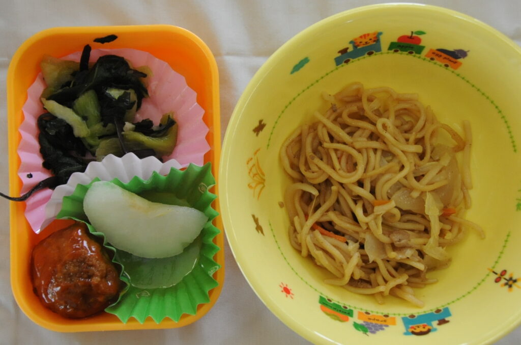では、今日の給食の様子をお知らせします。なお、写真のコメントは、いつものように制作者の想像です!あしからず!!給食メニューは、焼きそば、ケチャップ肉団子、青梗菜のナムル、梨 です。それでは、今日もおいしく、「いただきまぁす!!」