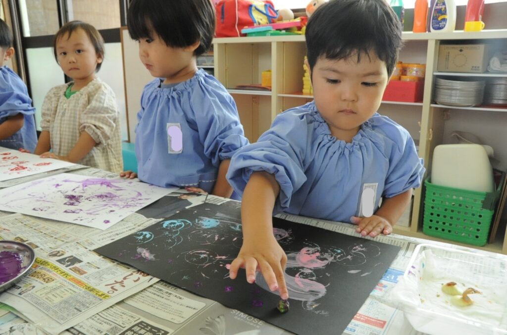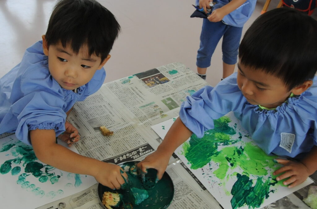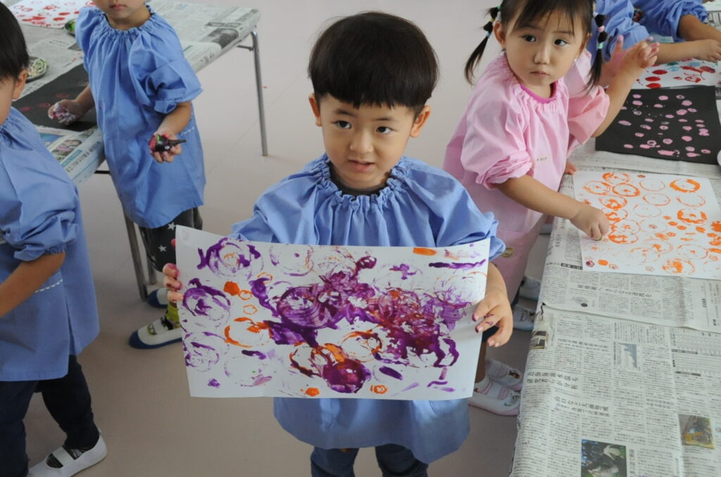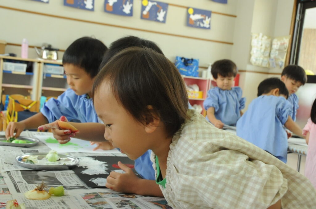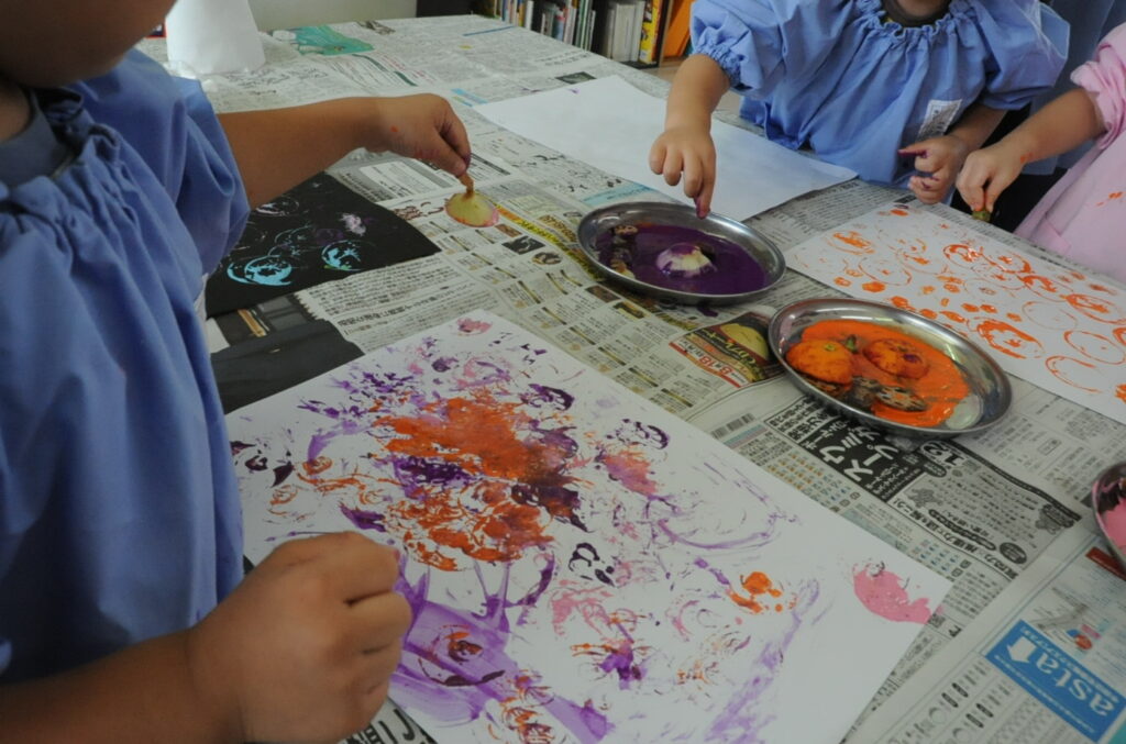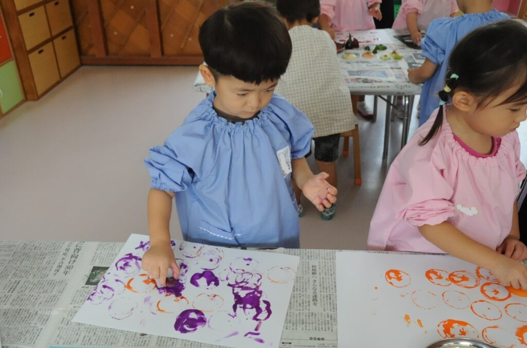 まつ組の子ども達は、野菜の切れ端「野菜スタンプ」を使って、「ぺんたん、ぺったん」しました。タマネギ、オレンジ、エノキダケなどいろいろなスタンプをうまく使って、世界に一つしかないスタンプ作品に仕上げました。