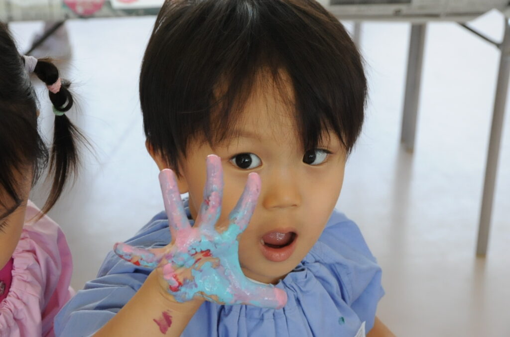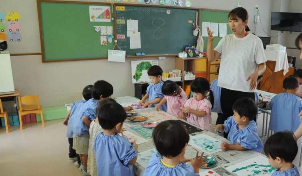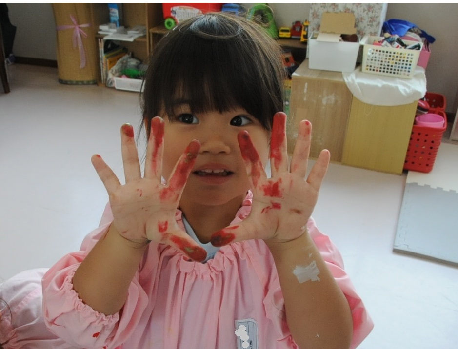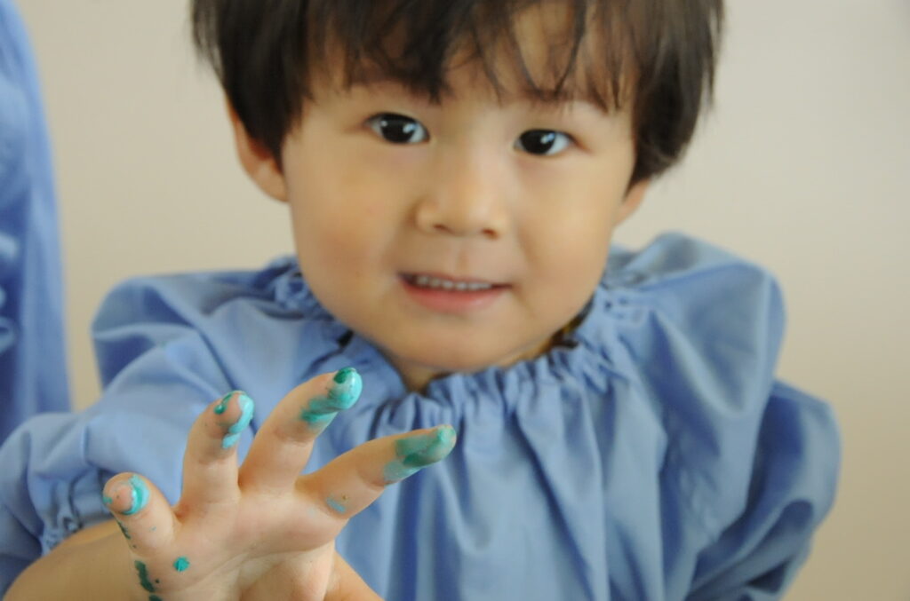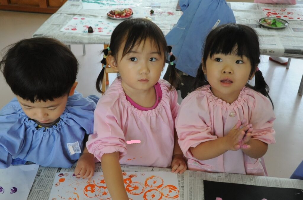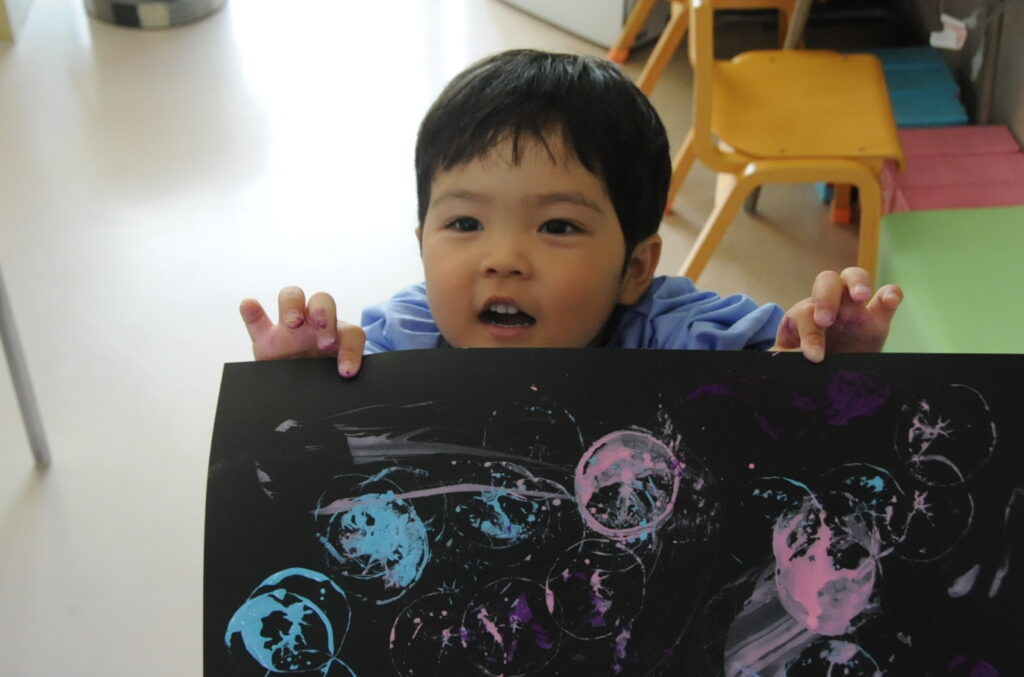 まつ組の子ども達は、野菜の切れ端「野菜スタンプ」を使って、「ぺんたん、ぺったん」しました。タマネギ、オレンジ、エノキダケなどいろいろなスタンプをうまく使って、世界に一つしかないスタンプ作品に仕上げました。