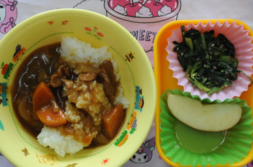 では、今日の給食の様子をお知らせします。なお、写真のコメントは、いつものように制作者の想像です!あしからず!!給食メニューは、カレーライス、ほうれん草のごま和え、りんご です。それでは、今日もおいしく、「いただきまぁす!!」
