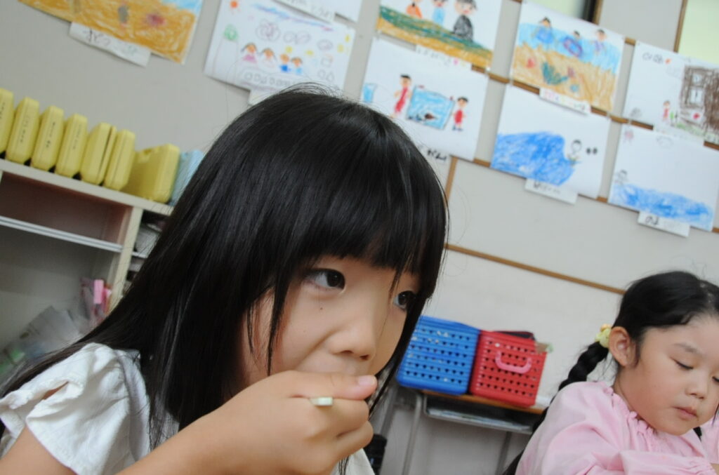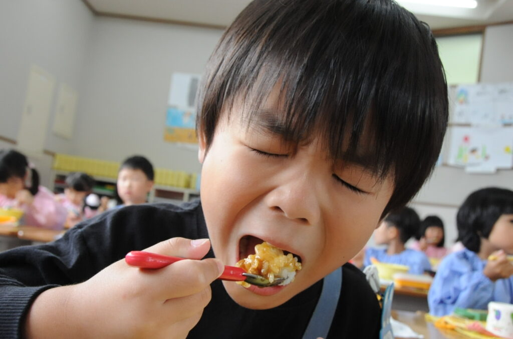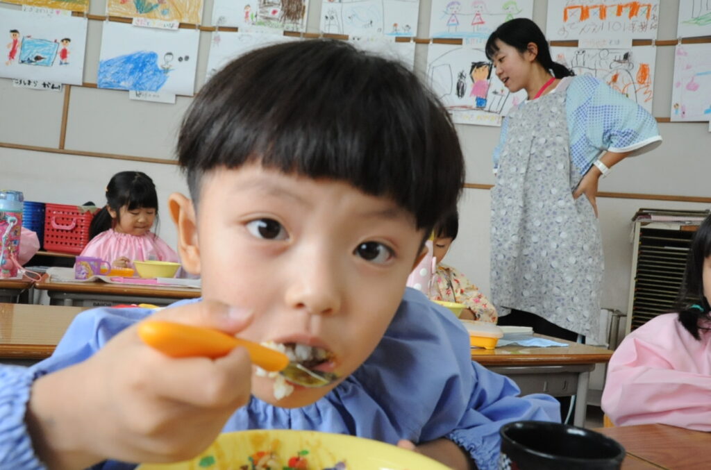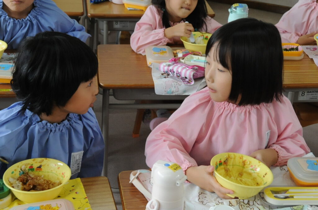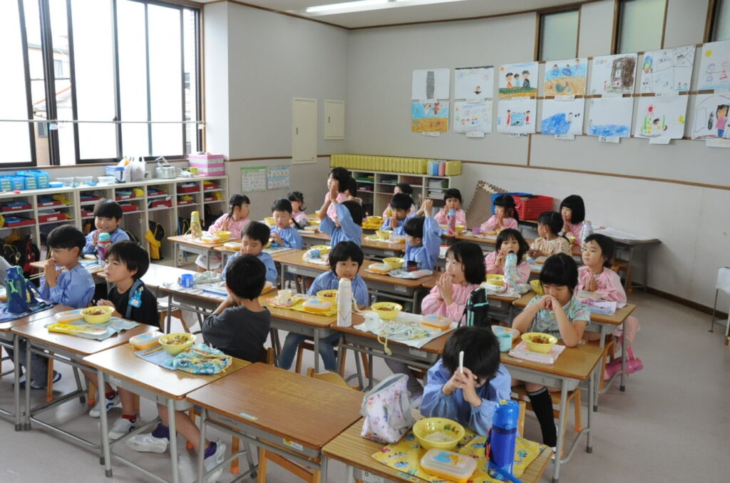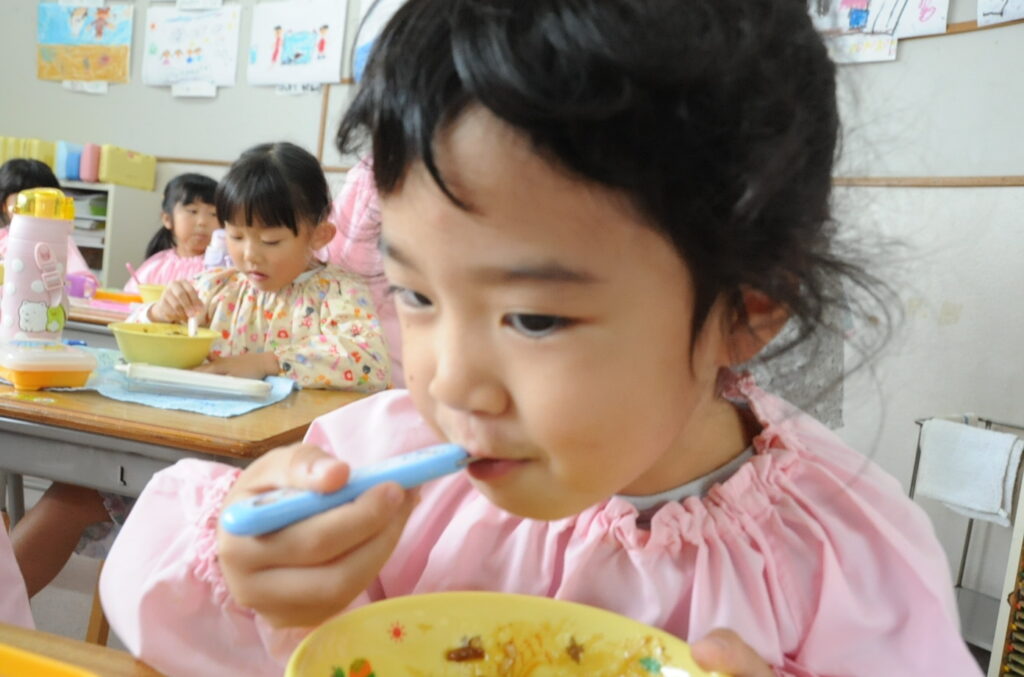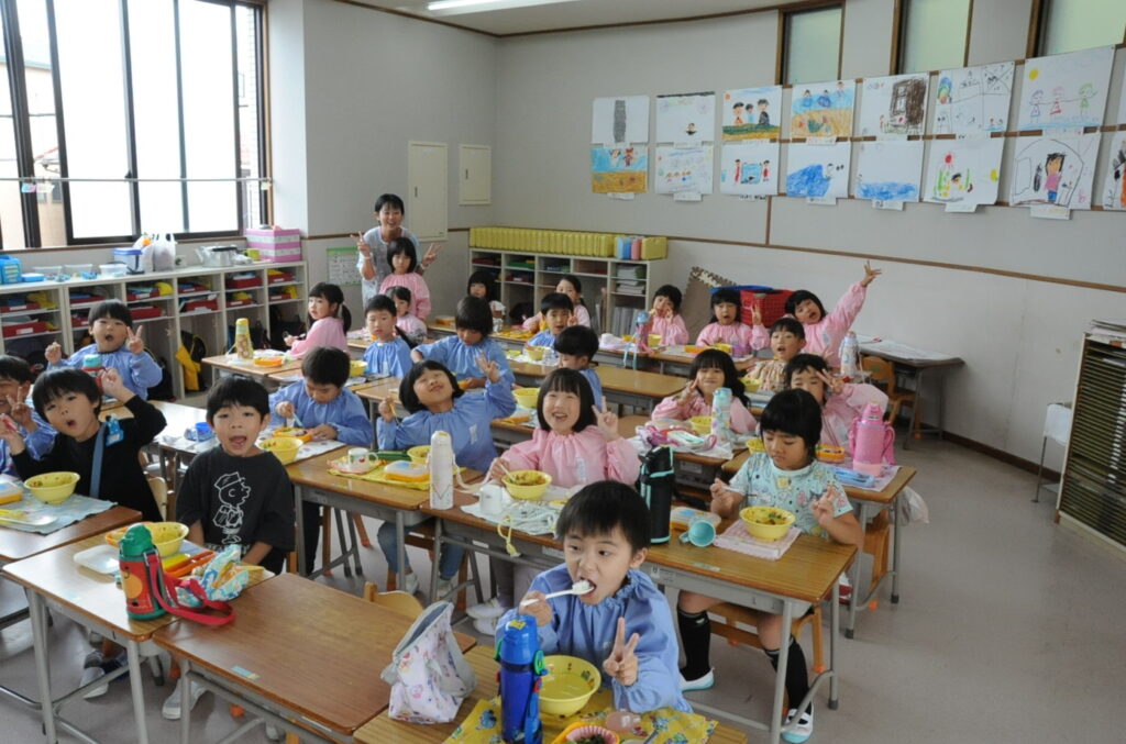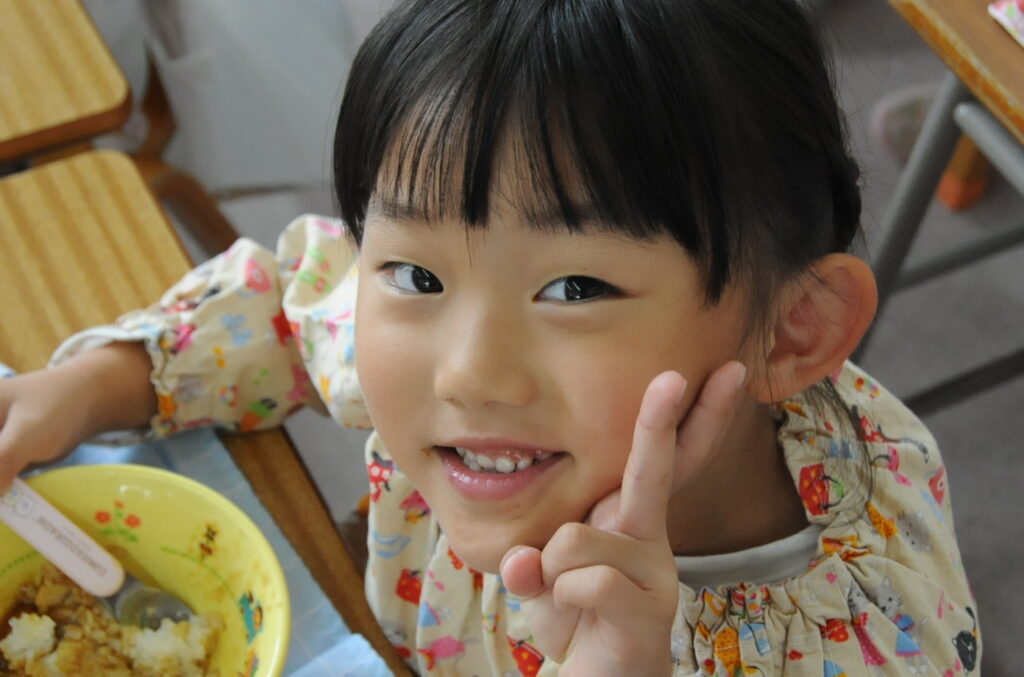 はい、すみれ組の皆さんは。今日もおいしくいただきました。「ごっちそうさまでしたぁ!!」