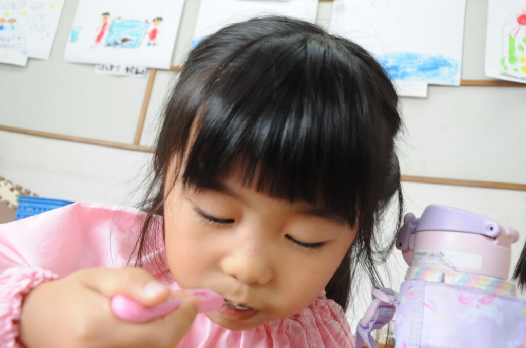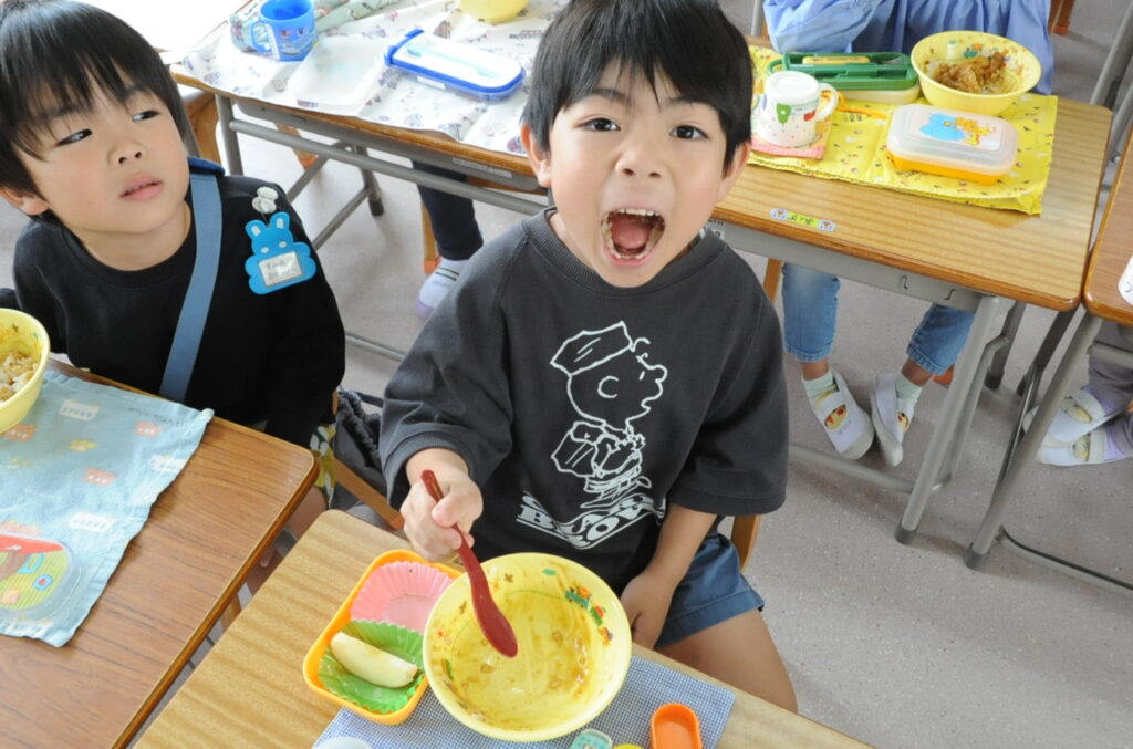 すみれ組は、どの子もお友達と楽しく食べていました。完食する子がが多く、元気いっぱいです。すみれ組さんは明るく元気です。「食べる子は育つ!」です。がんばりましょう!!