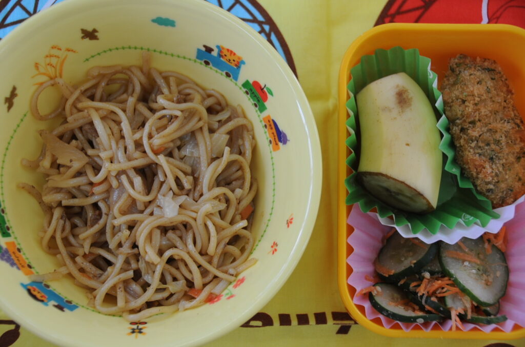 では、今日の給食の様子をお知らせします。なお、写真のコメントは、いつものように制作者の想像です!あしからず!!給食メニューは、焼きそば、ささみ磯辺揚げ、胡瓜の胡麻和え、バナナ です。それでは、今日もおいしく、「いただきまぁす!!」