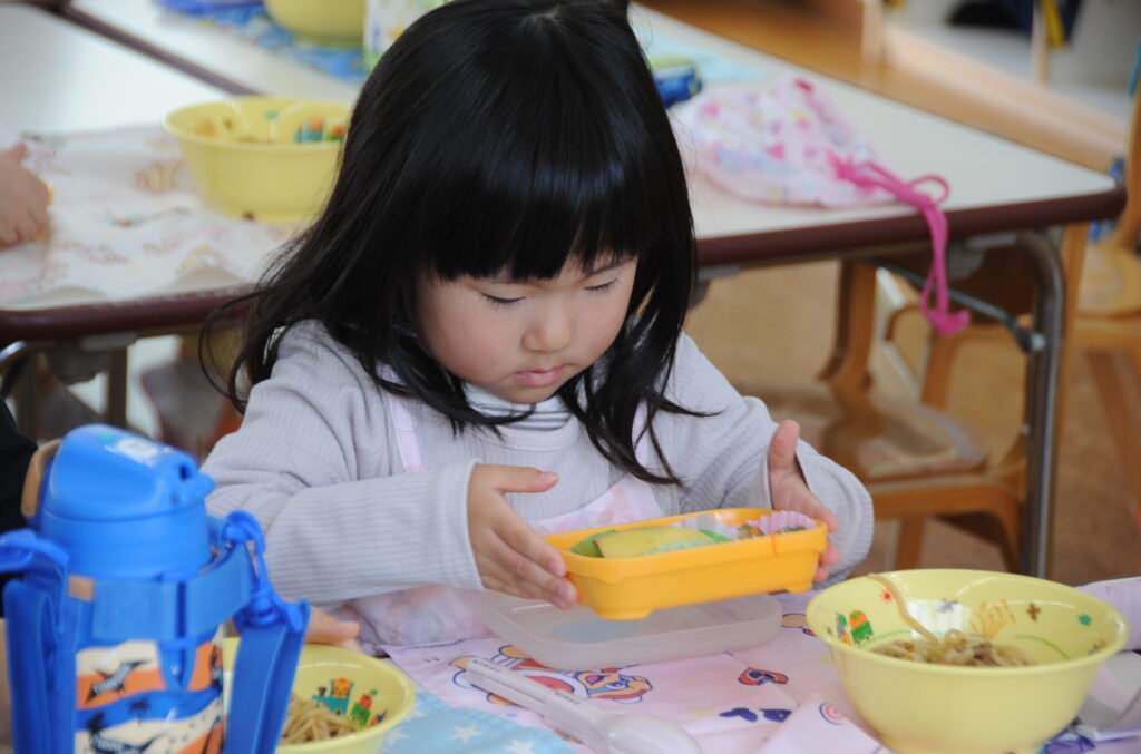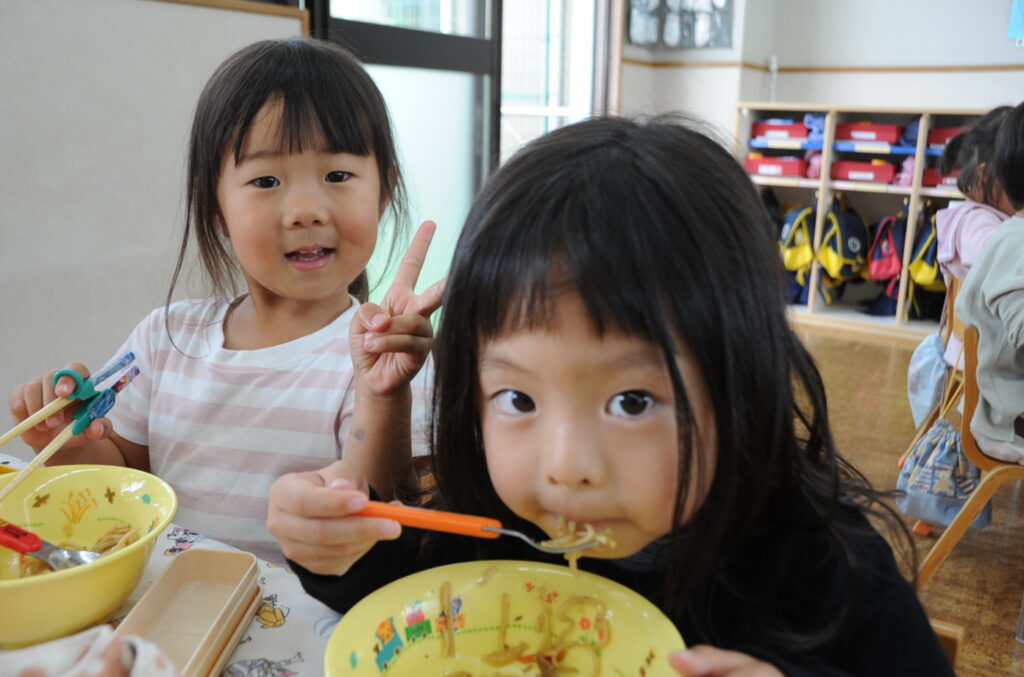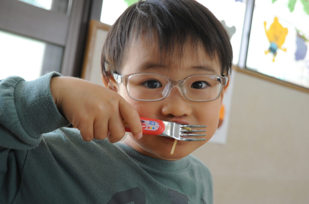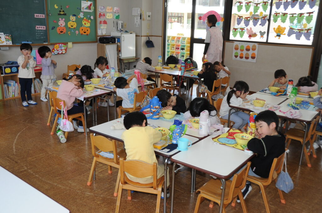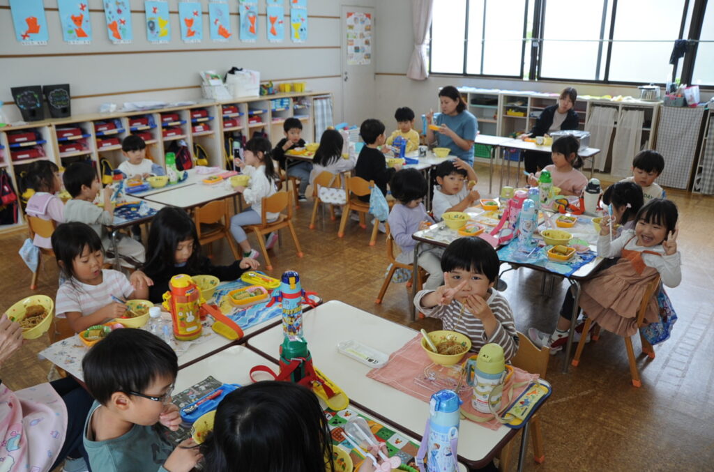 もも組は、どの子もお友達と楽しく食べていました。もも組さんは明るく元気です。「食べる子は育つ!」です。がんばりましょう!!