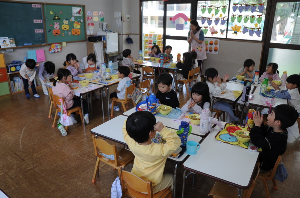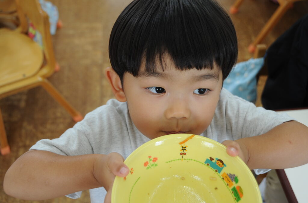 はい、もも組の皆さんは、今日もおいしくいただきました。「ごっちそうさまでしたぁ!!」
