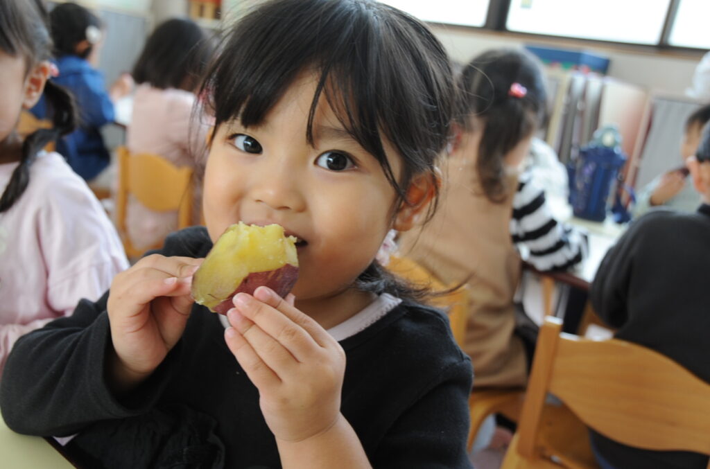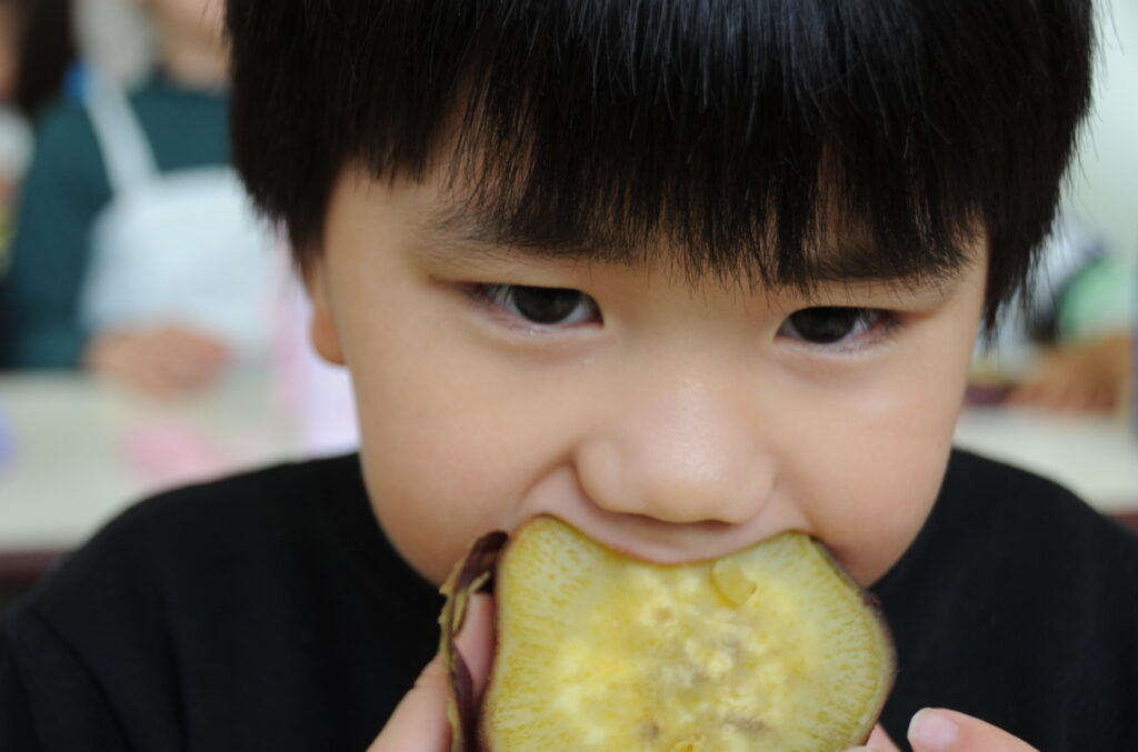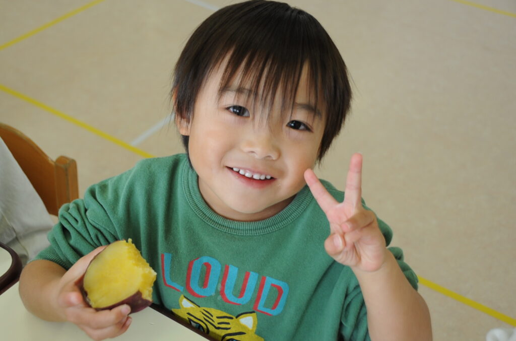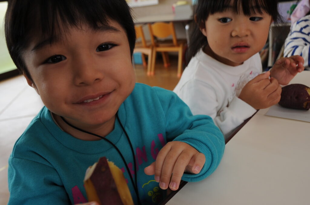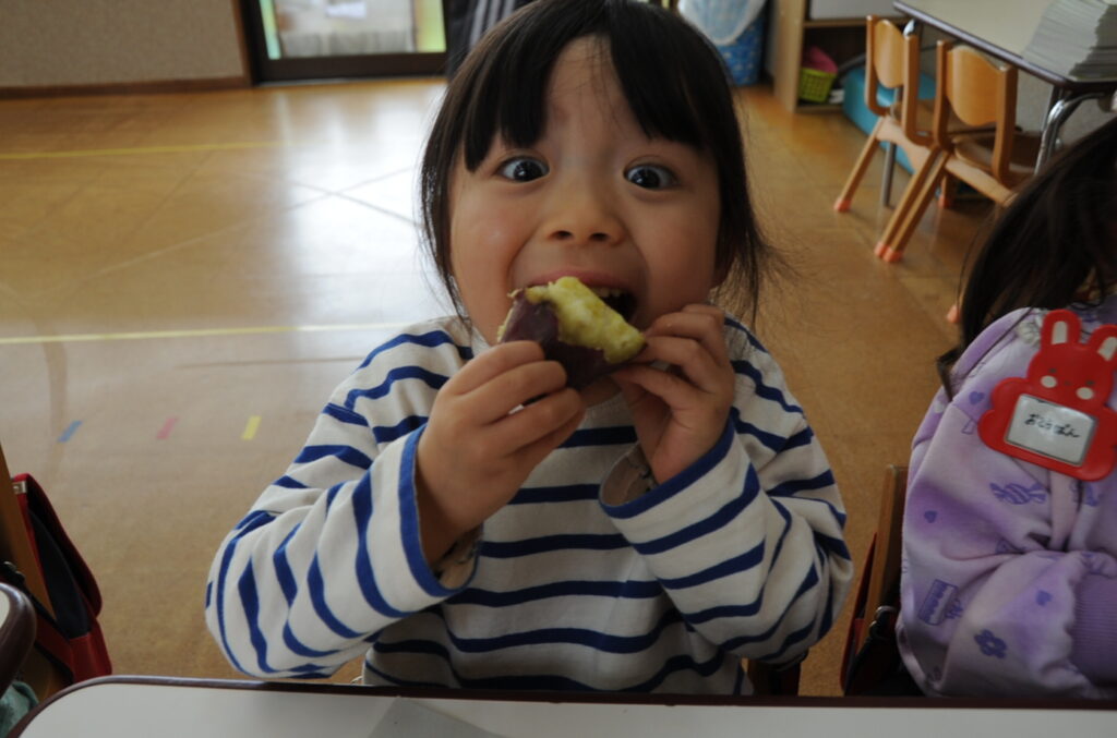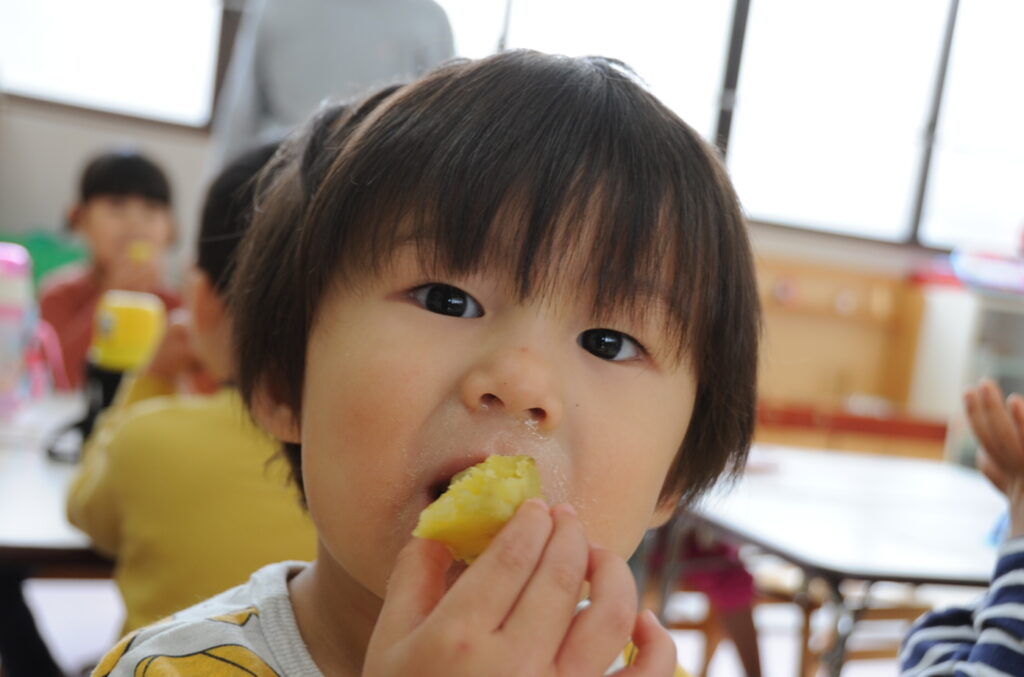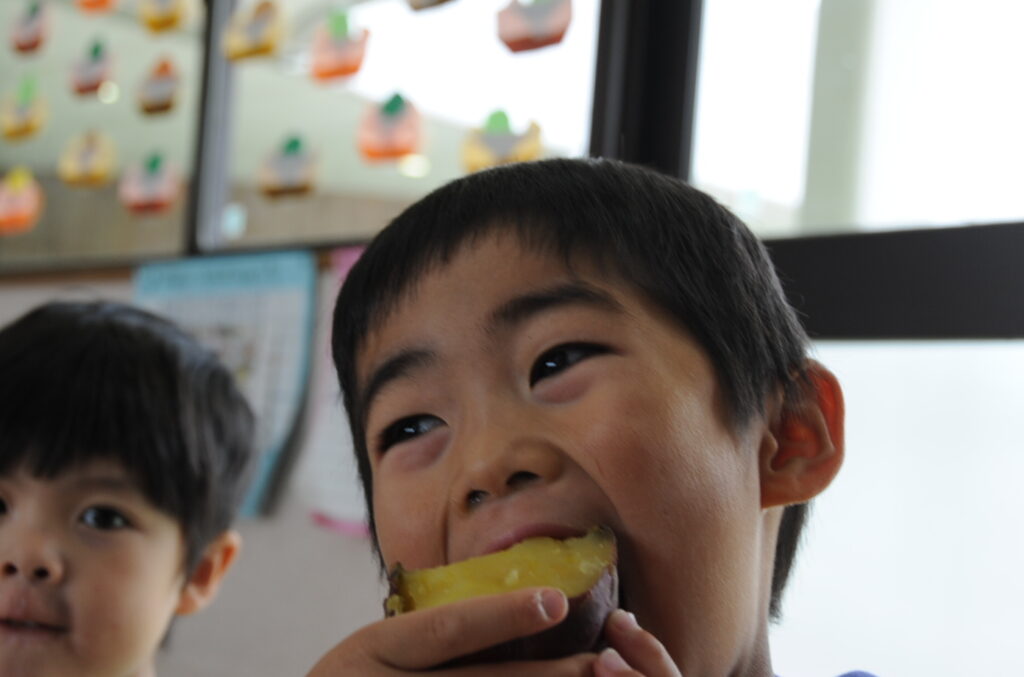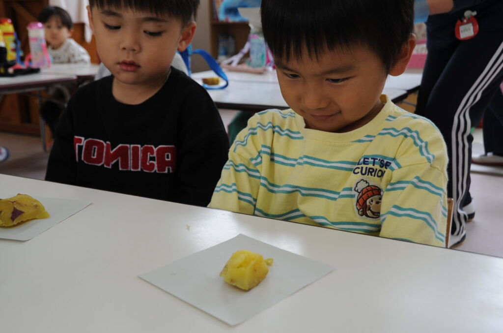 今日は、おいもの試食会です。年中さんが掘ってきたおいもをみんなでおいしくいただきます。ほっくほっくで、おいしいですよぉ!!なお、写真のコメントは、いつものように制作者の想像です!あしからず!!