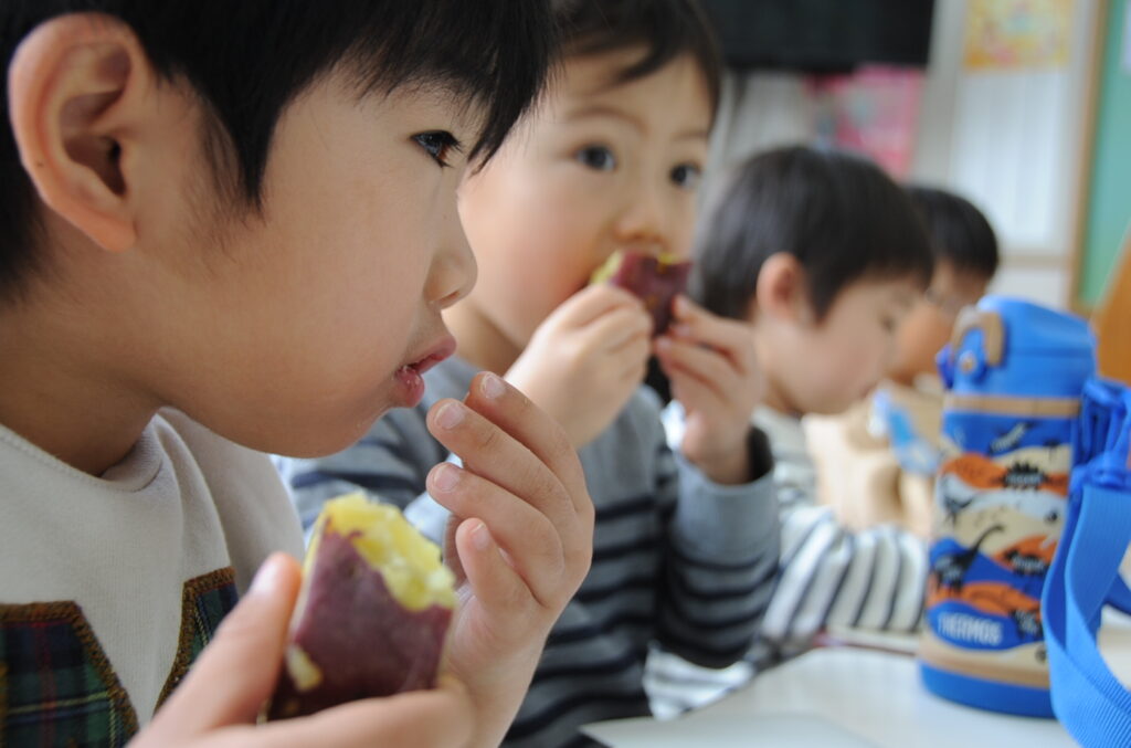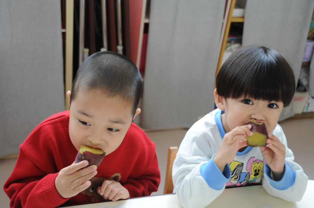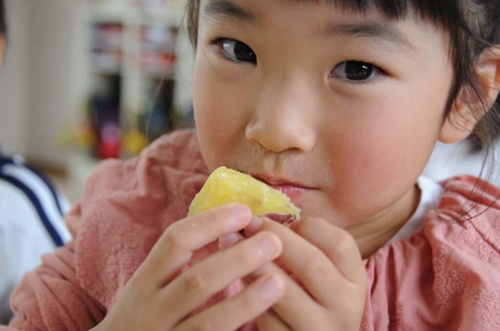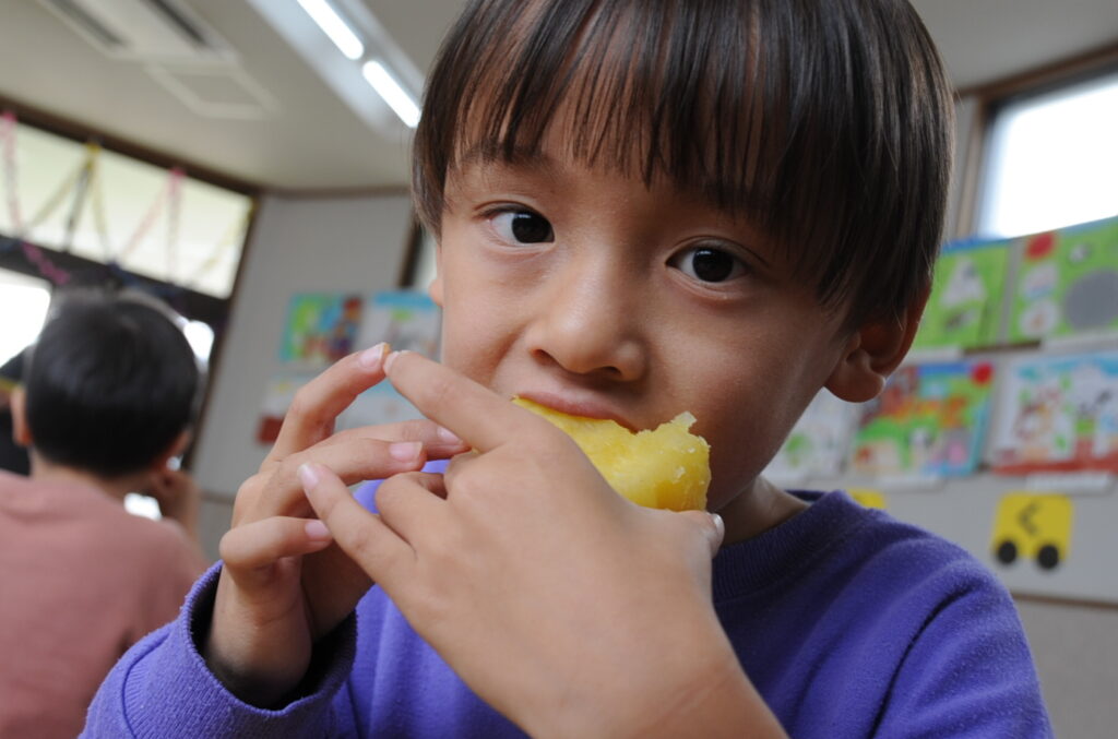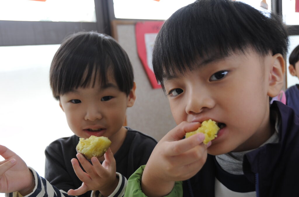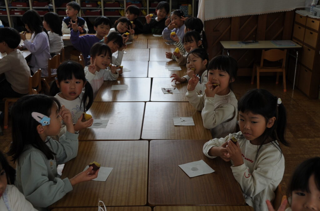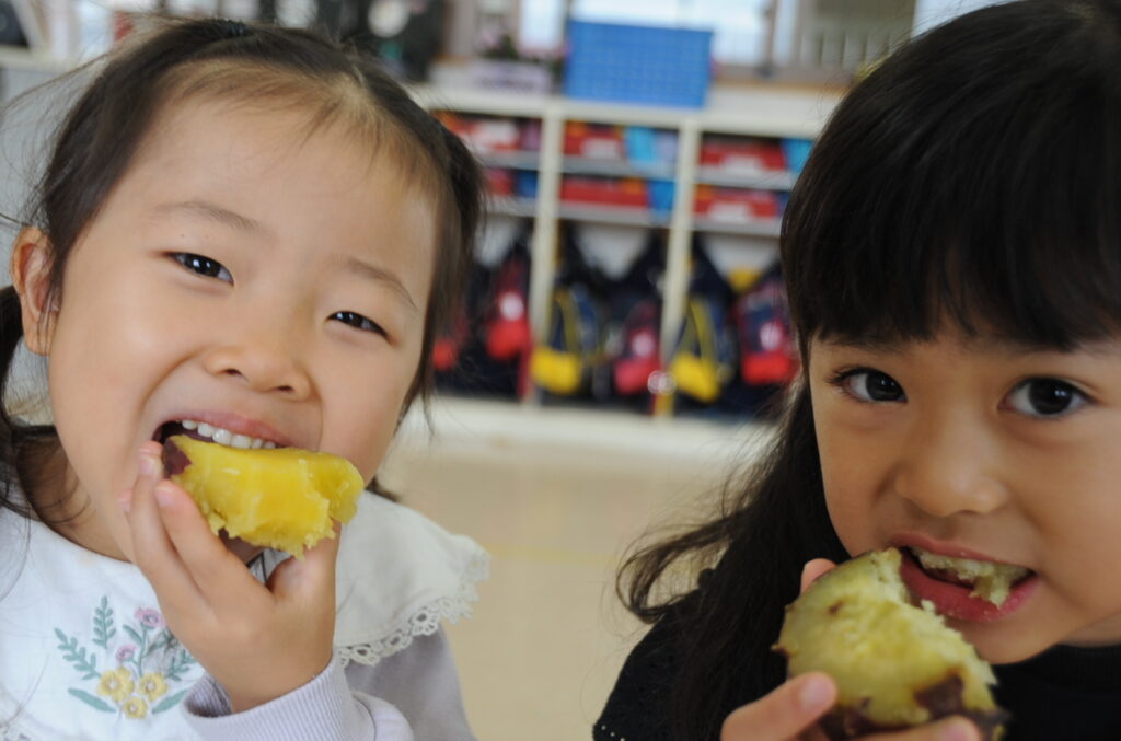 今日は、おいもの試食会です。年中さんが掘ってきたおいもをみんなでおいしくいただきます。ほっくほっくで、おいしいですよぉ!!なお、写真のコメントは、いつものように制作者の想像です!あしからず!!