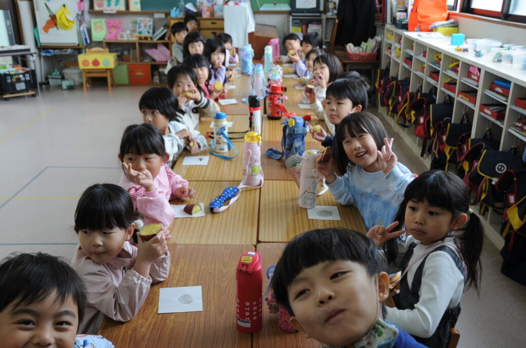 昨年秋、当時の年中(現、年長)がいもほりをしました。とても楽しかったのでしょう、ぜひとも、この感動を次の年中さん達にも味わわせたいと子ども達が考え、この春、いもの苗を植えました。そしてこの秋、年中さんがいもほりをしました。今年もたっくさん収穫し、みんなでおいしくいただきました。そして、年中さんはきっとこう思うでしょう、いもほりの感動を次の年中さんにも味わってほしい、年中さんのためにいもの苗を植えようと。こうやって、学びは連続していくのです。これが祇園幼稚園の伝統です・・・。今日は、かっこいい終わり方です(笑)