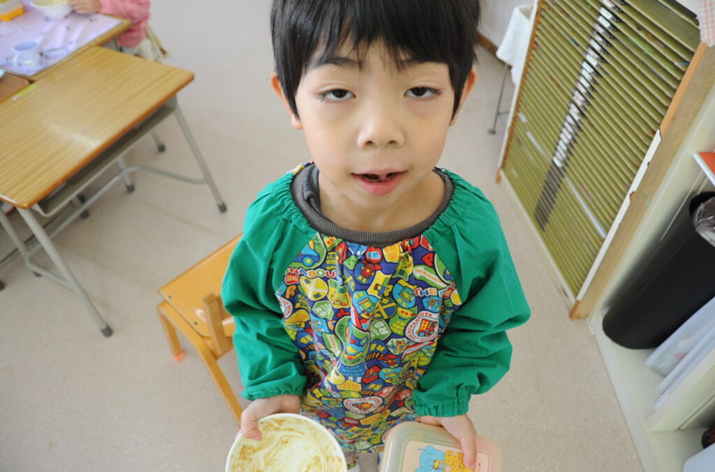 すみれ組は、みんなでわいわい、楽しく食べていました。しっかり食べる子が多くて、多くの子がおかわりをしました。ですから、あっという間になくなりました。たくさん食べることは、とても素晴らしいことです。「食べる子は育つ!」です。