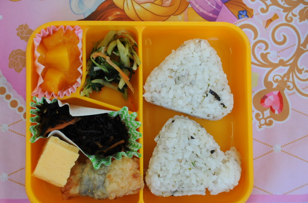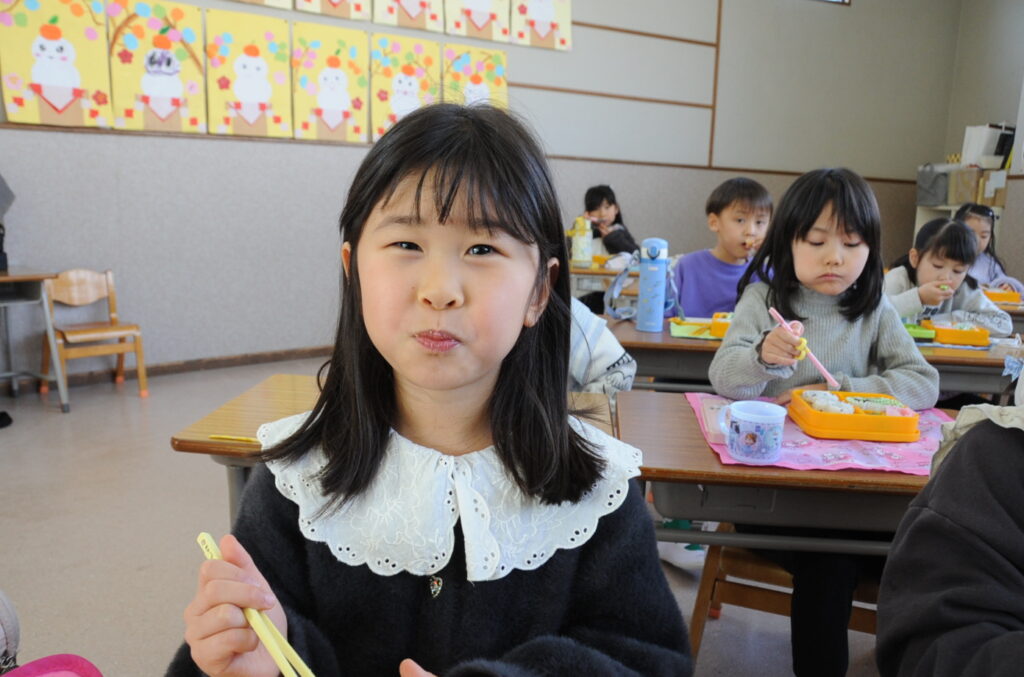 では、今日の給食の様子をお知らせします。給食メニューは、海苔巻きチキン、野菜オムレツ、ひじきの煮物、水菜のお浸し、マンゴーのシロップ漬け、海苔胡麻むすび です。なお、写真のコメントは、いつものように制作者の想像です!あしからず!!それでは、今日もおいしく、「いただきまぁす!!」