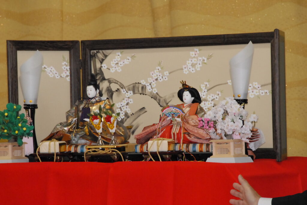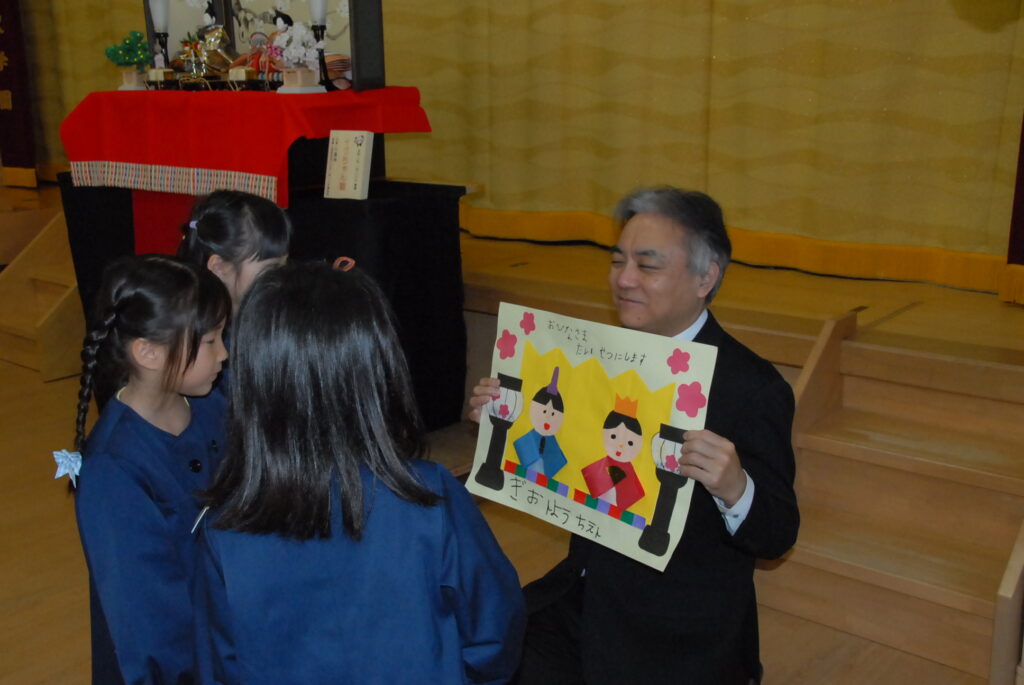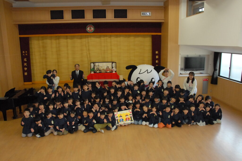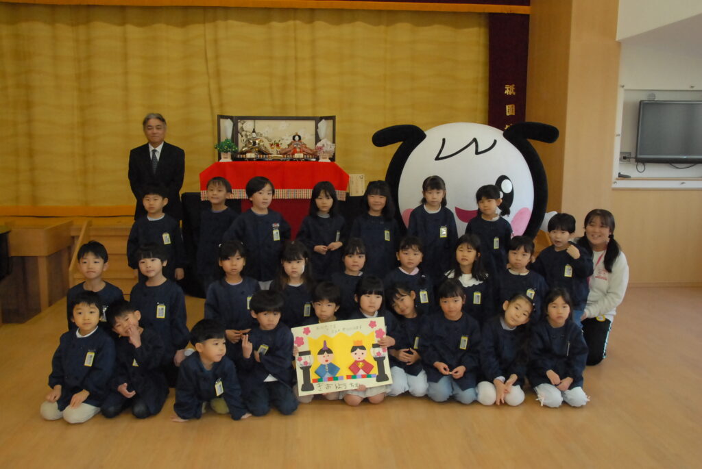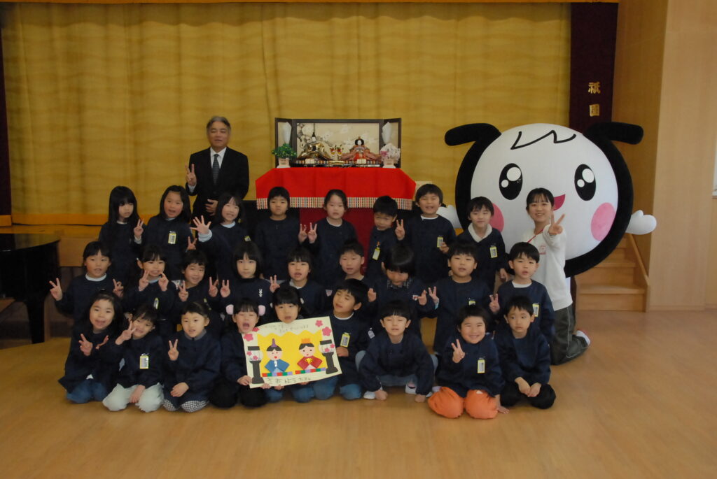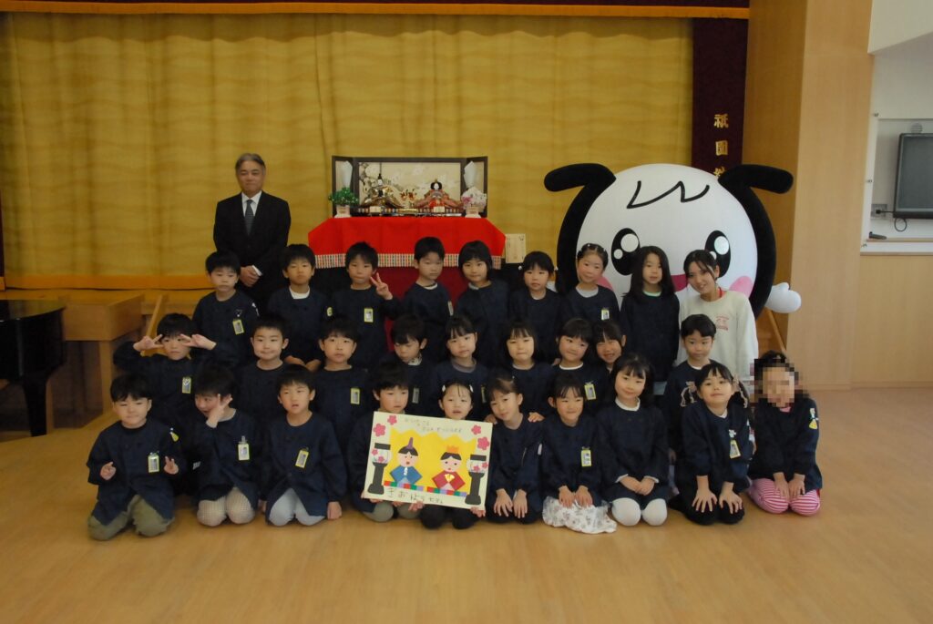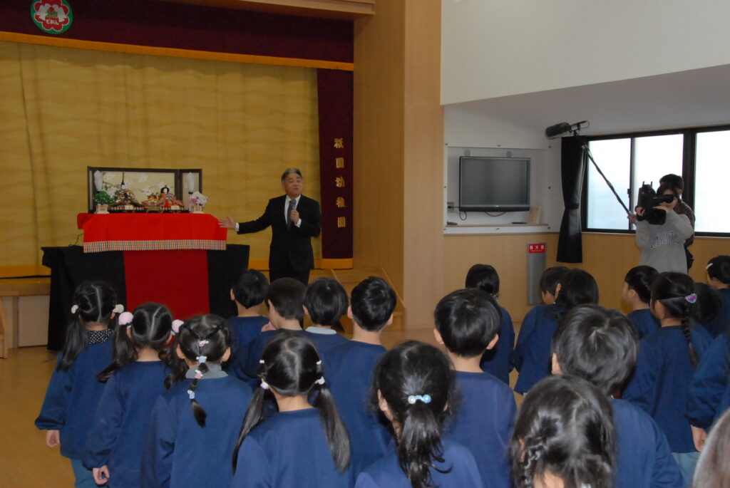 「人形の藤娘」様が祇園幼稚園の子ども達のために、ひな人形をプレゼントしてくださることになりました。そこで、年長組さんと「ようこそ、おひな様」会を開きました。遊戯室ステージ前に、きれいなおひな様とかっこいいお内裏様が鎮座しています。会の様子をお知らせします。なお、写真のコメントは、いつものように制作者の想像です!あしからず!!