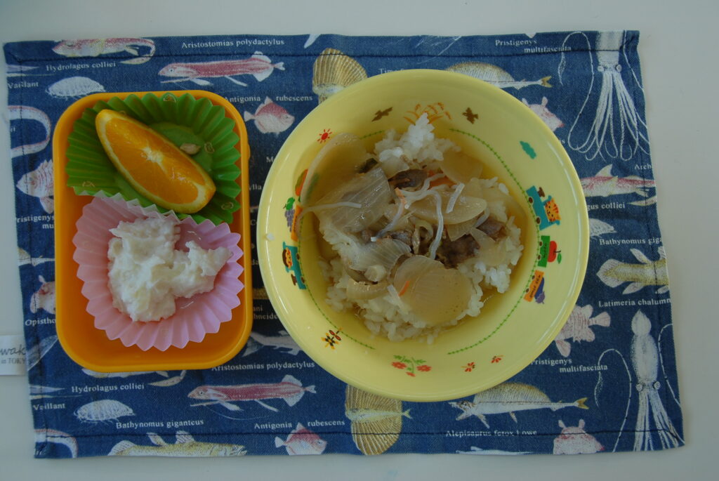 では、今日の給食の様子をお知らせします。給食メニューは、牛丼、ポテトサラダ、オレンジ です。なお、写真のコメントは、いつものように制作者の想像です!あしからず!!それでは、今日もおいしく、「いただきまぁす!!」