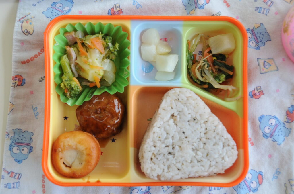 では、今日の給食の様子をお知らせします。給食メニューは、照り焼ハンバーグ、プチアメリカンドッグ、ブロッコリーのコンソメ煮、三色ナムル、洋梨のシロップ漬、ゆかりむすび です。なお、写真のコメントは、いつものように制作者の想像です!あしからず!!それでは、今日もおいしく、「いただきまぁす!!」