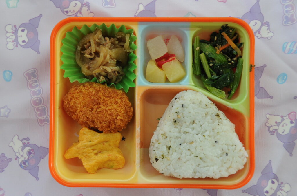 では、今日の給食の様子をお知らせします。給食メニューは、コーンクリームコロッケ、五目しんじょ、牛丼風煮、小松菜の胡麻和え、フルーツカクテル、海苔胡麻むすび です。なお、写真のコメントは、いつものように制作者の想像です!あしからず!!それでは、今日もおいしく、「いただきまぁす!!」