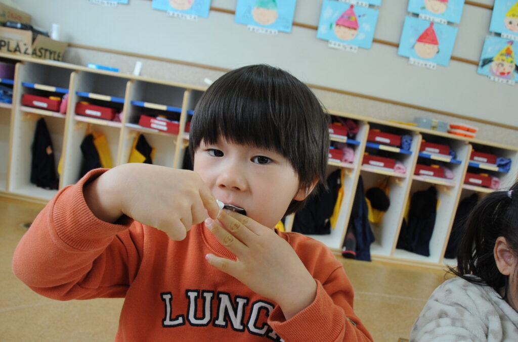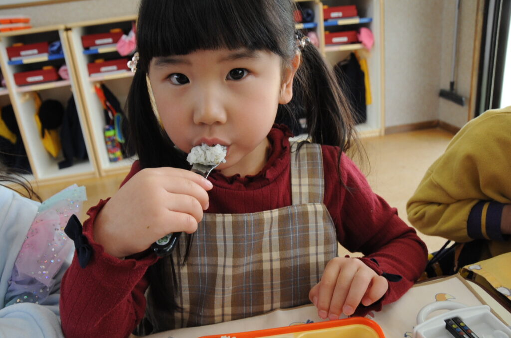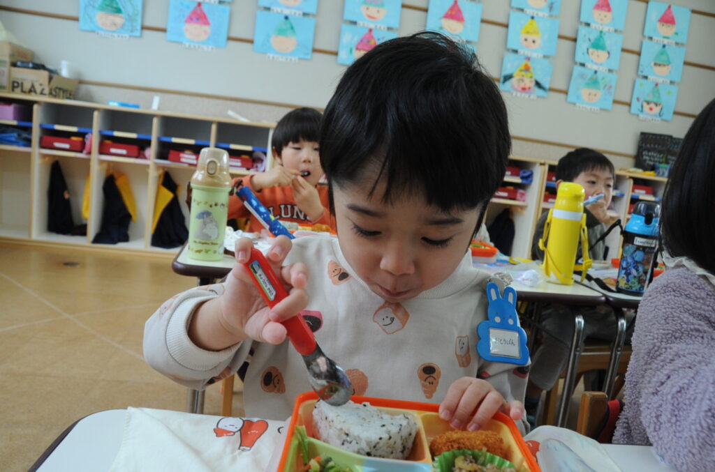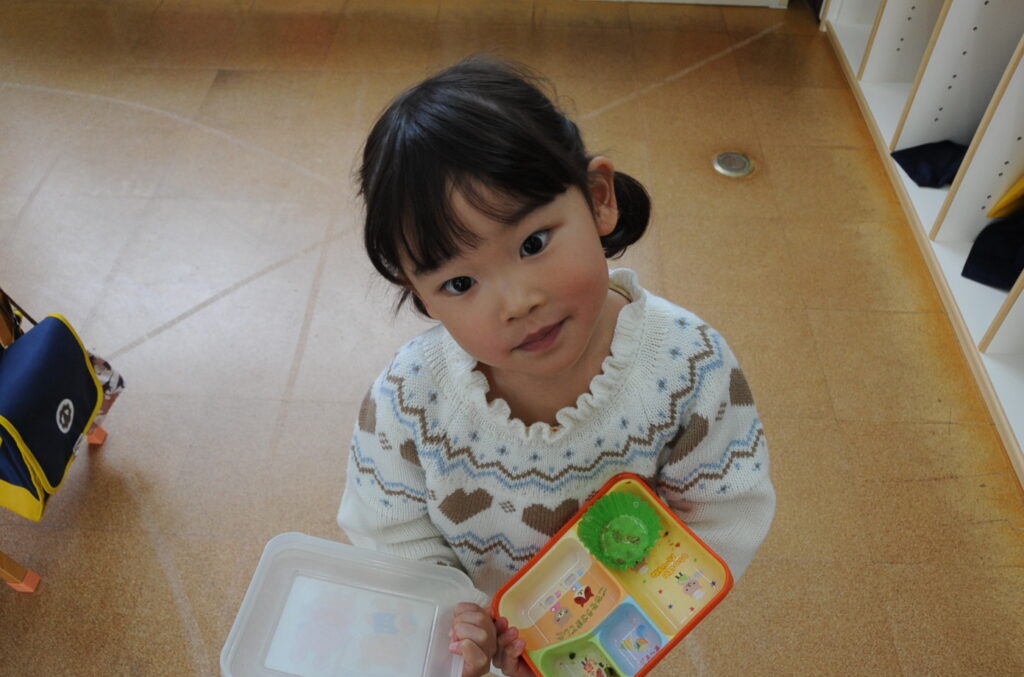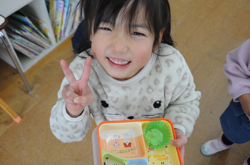 ほうれん草が苦手な子がいましたが、「ほうれん草は、食べるとパワーが出るよ!」と伝えると、がんばって食べる子、続出です。くり組の子は、わいわい楽しく食べることができます。明るく元気に食べきると、全てが体と心の栄養になるでしょう。とても素晴らしいことです。大きくなりますよぉ!「食べる子は育つ!」です。