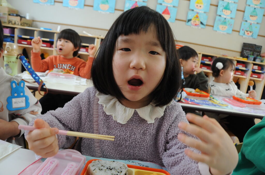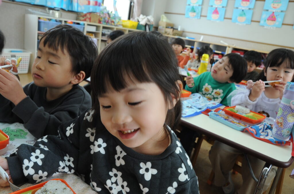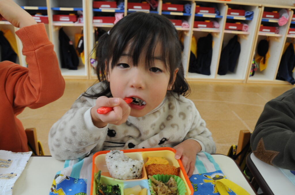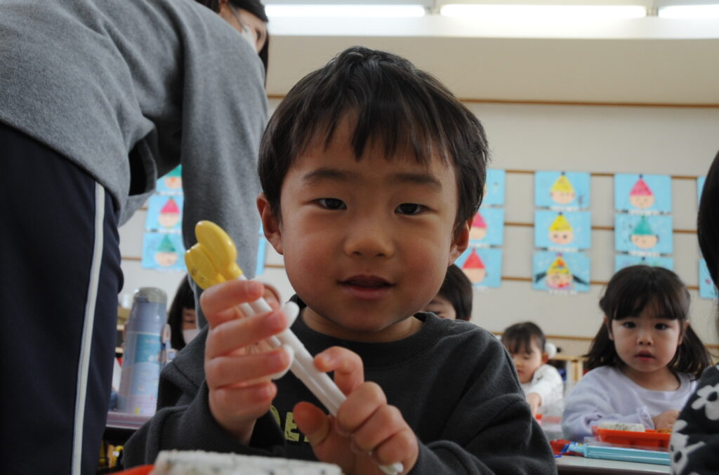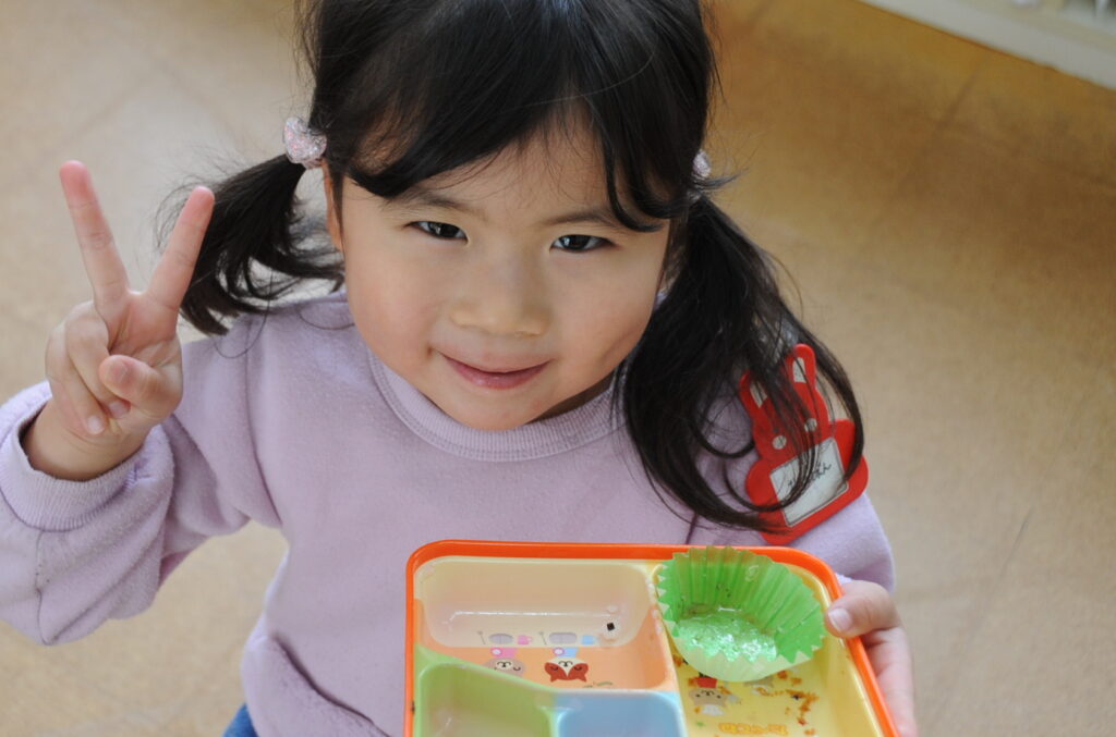 ほうれん草が苦手な子がいましたが、「ほうれん草は、食べるとパワーが出るよ!」と伝えると、がんばって食べる子、続出です。くり組の子は、わいわい楽しく食べることができます。明るく元気に食べきると、全てが体と心の栄養になるでしょう。とても素晴らしいことです。大きくなりますよぉ!「食べる子は育つ!」です。