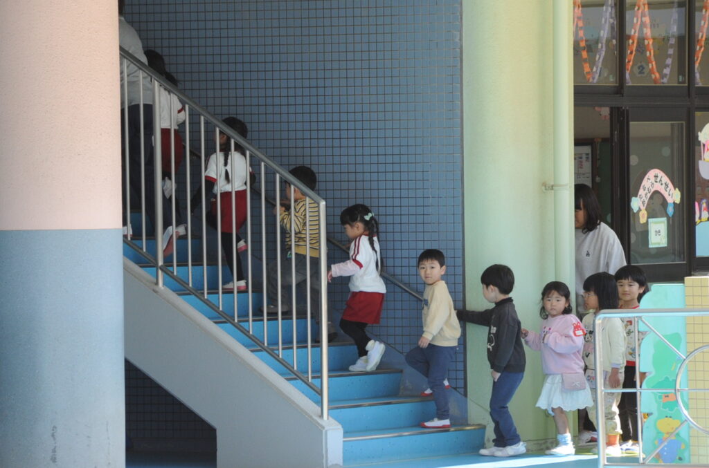 今日は、洪水の避難訓練をしました。祇園幼稚園の近くには、太田川や八木用水が流れています。大雨が降って、それらが氾濫することも考えられます。訓練では、1階にいる年少組とまつ、くり組さんが2階に避難しました。