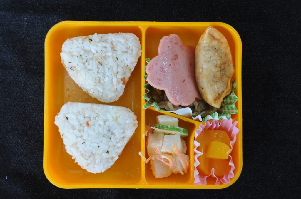 では、今日の給食の様子をお知らせします。給食メニューは、揚ギョーザ、花ソーセージ、豚肉の生姜炒め、ポテトサラダ、マンゴープリン、鮭菜飯むすび です。なお、写真のコメントは、いつものように制作者の想像です!あしからず!!それでは、今日もおいしく、「いただきまぁす!!」