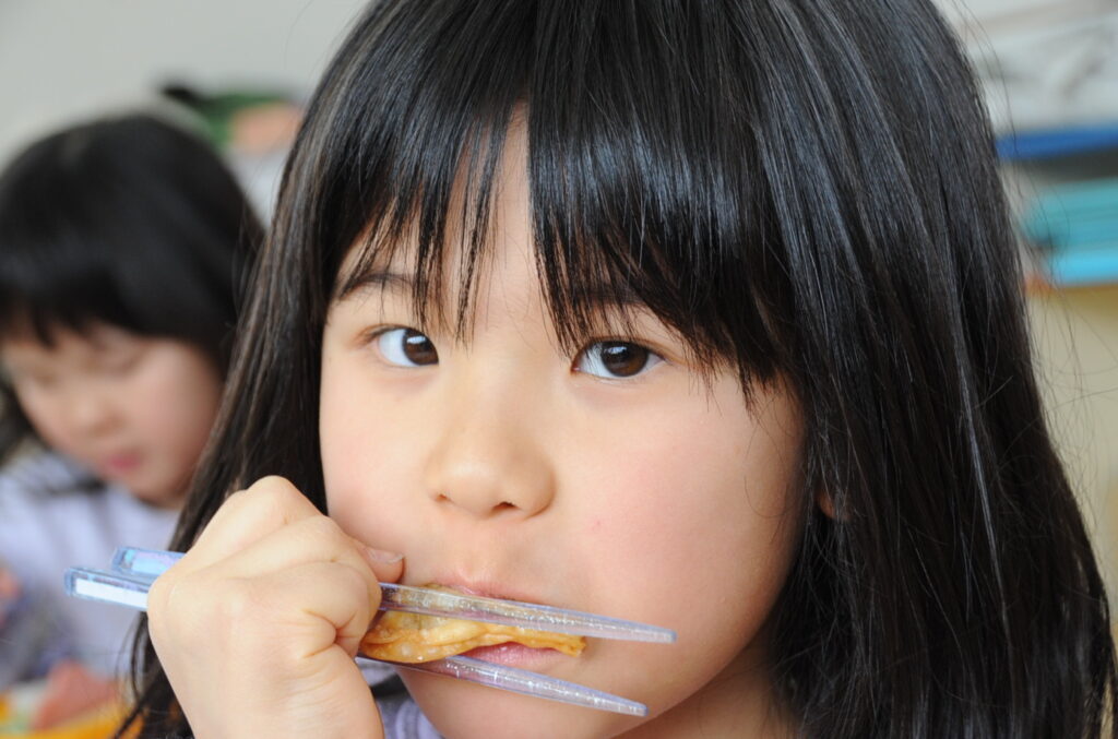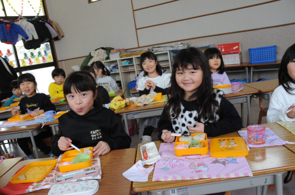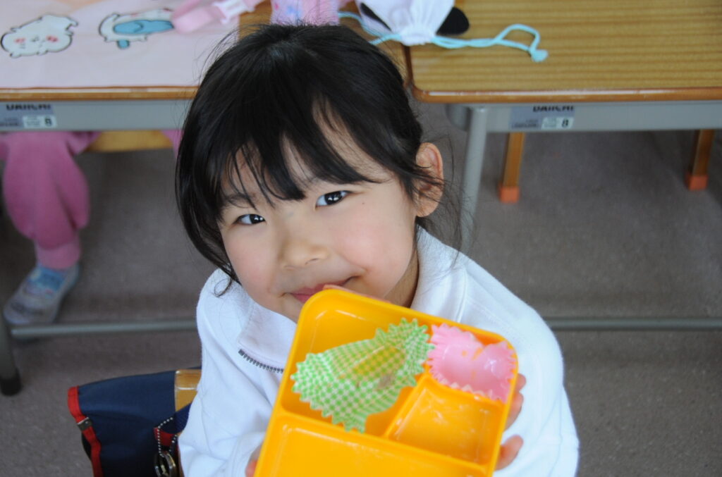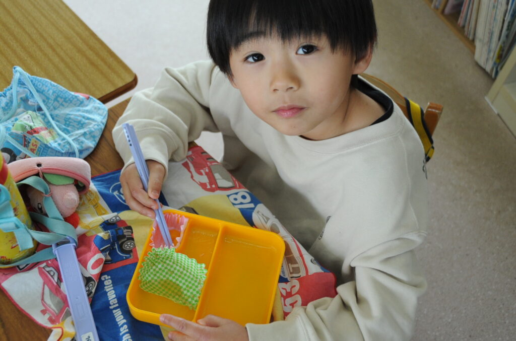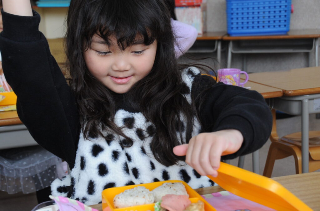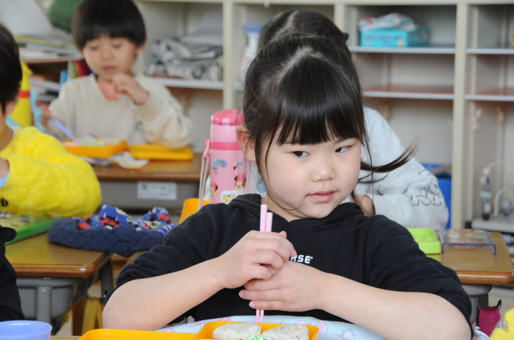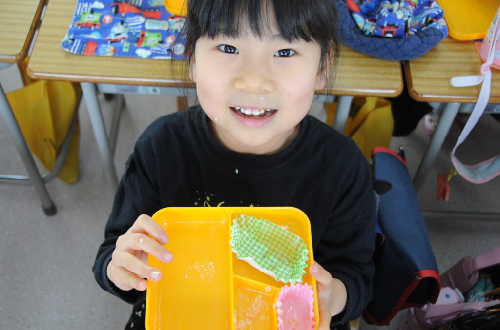 あやめ組の子ども達は、園長先生が写真を撮りに来たので若干興奮ぎみでした(ごめんなさい!)が、みんなでお話をしながら仲良く食べていました。食事を楽しむことはよいことです。この調子で1年生になってもしっかり給食を食べてくださいね。明るく元気なあやめ組の子ども達も大きくなりますよぉ!「食べる子は育つ!」です。
