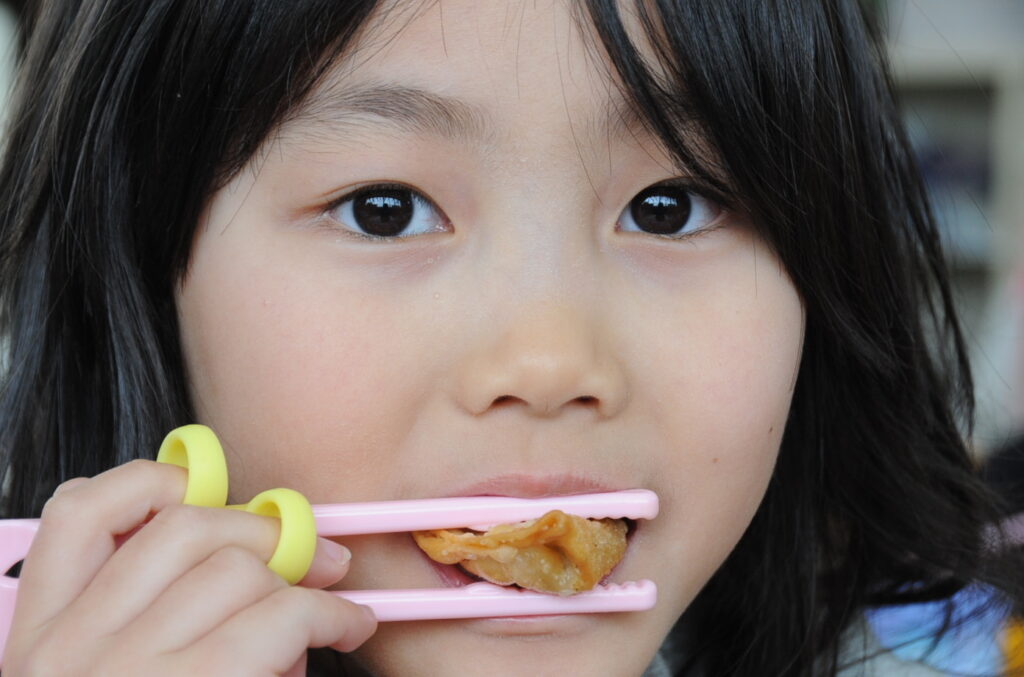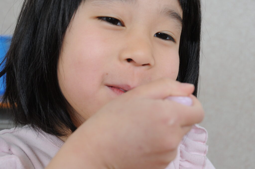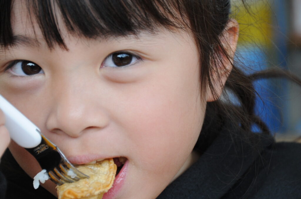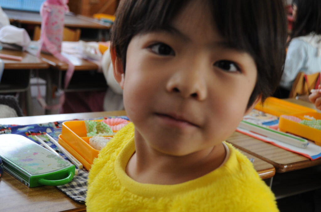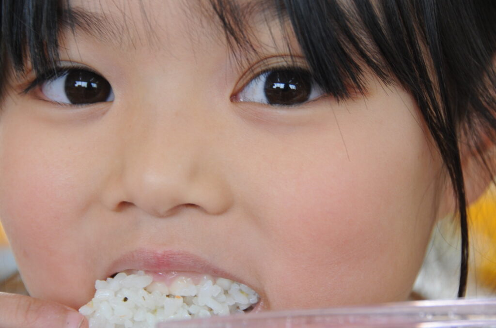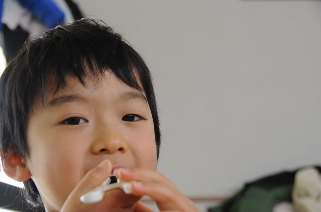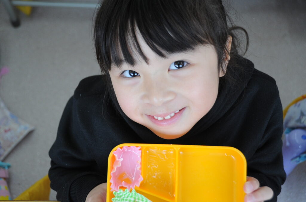 あやめ組の子ども達は、園長先生が写真を撮りに来たので若干興奮ぎみでした(ごめんなさい!)が、みんなでお話をしながら仲良く食べていました。食事を楽しむことはよいことです。この調子で1年生になってもしっかり給食を食べてくださいね。明るく元気なあやめ組の子ども達も大きくなりますよぉ!「食べる子は育つ!」です。