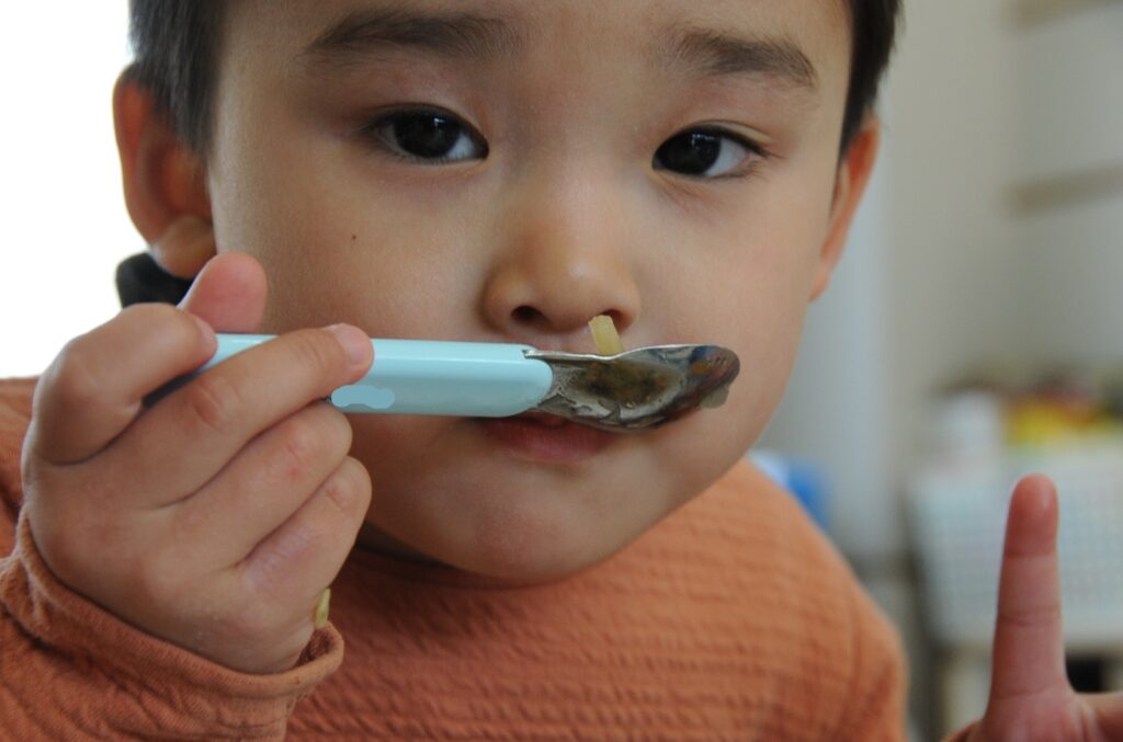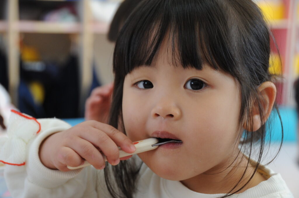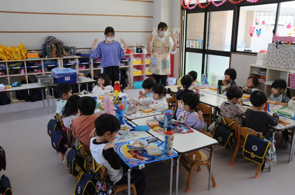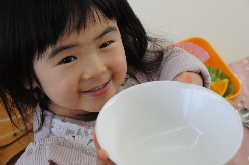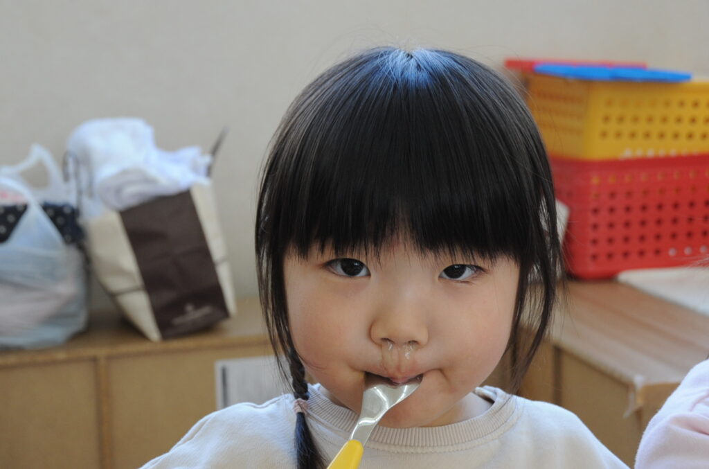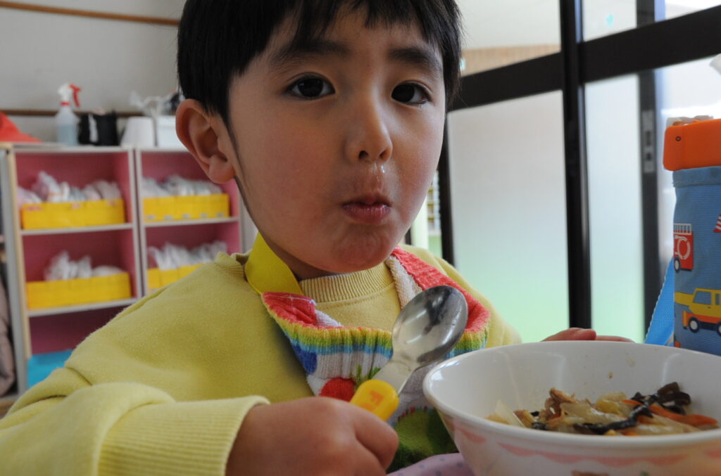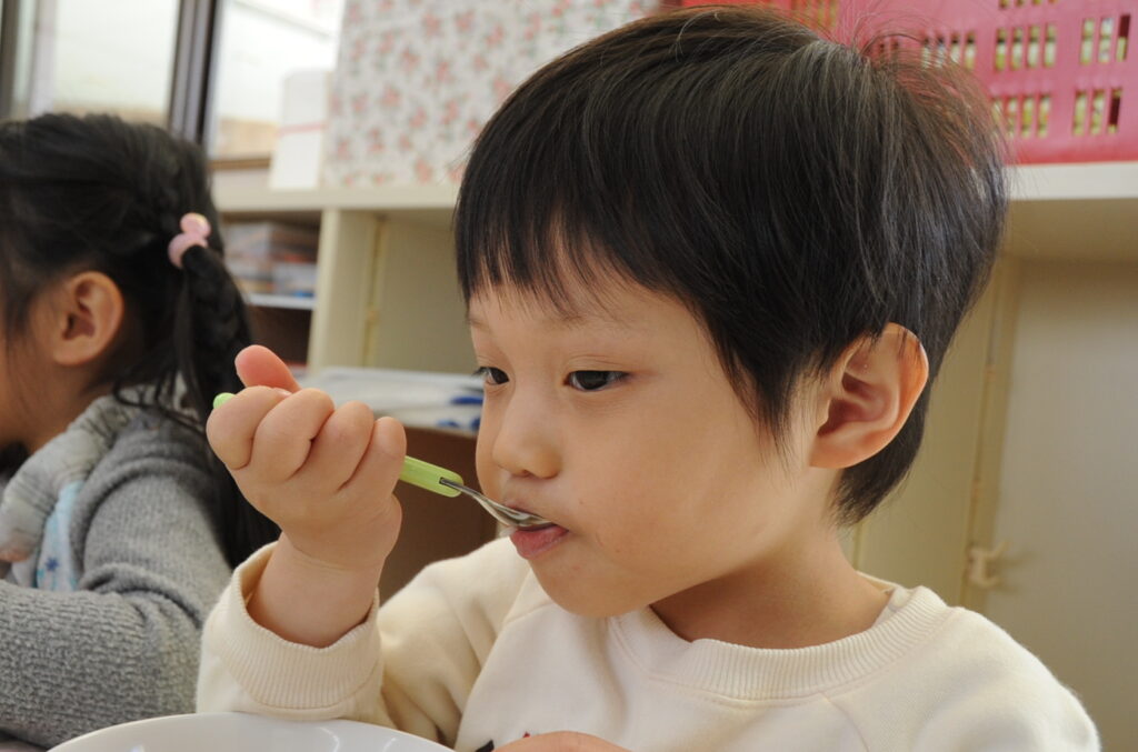 まつ組さんは、先週からインフルエンザの大波がやってきています。今日も欠席者がいたのですが、それ以外の子ども達は元気いっぱいです。最後の給食もしっかり食べて元気もりもりです。まつ組の子ども達は、もう少しで年少組です。たくさん食べてもっともっと大きくなりましょう。「食べる子は育つ!」です。