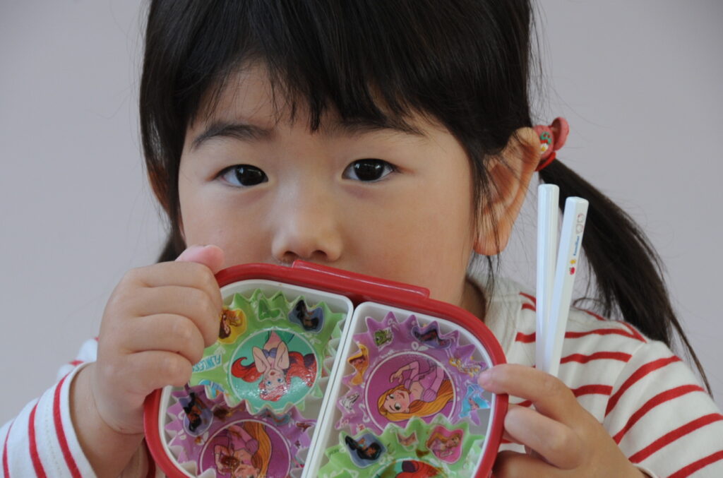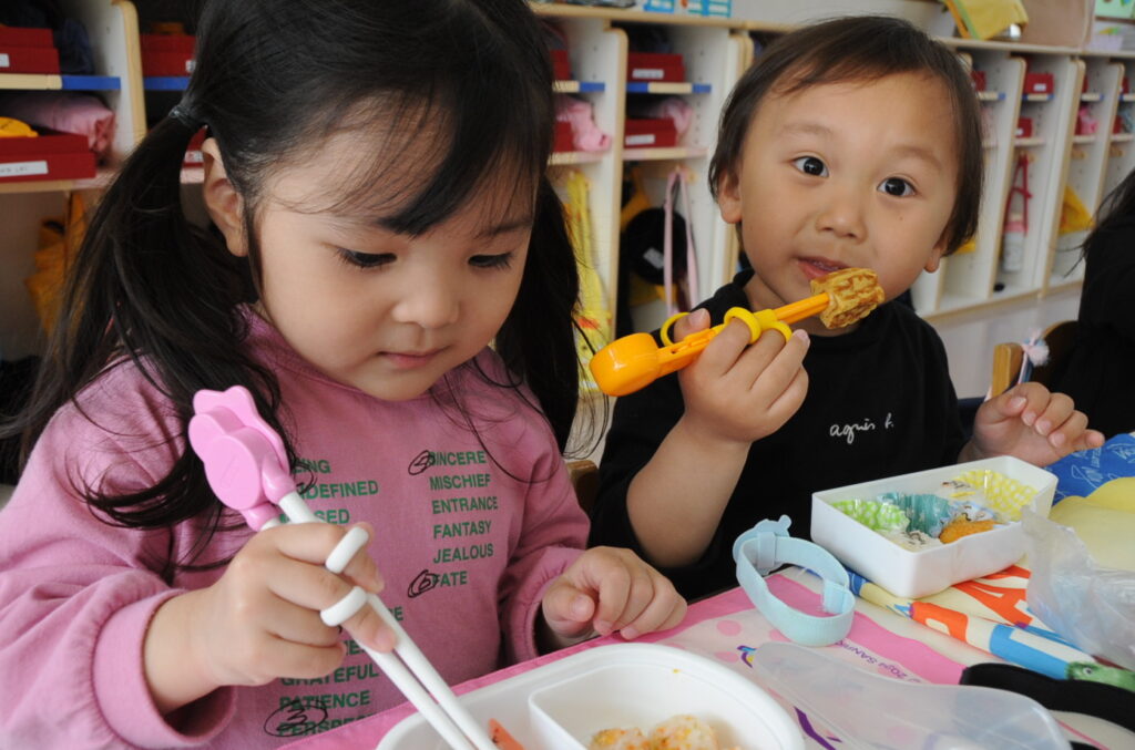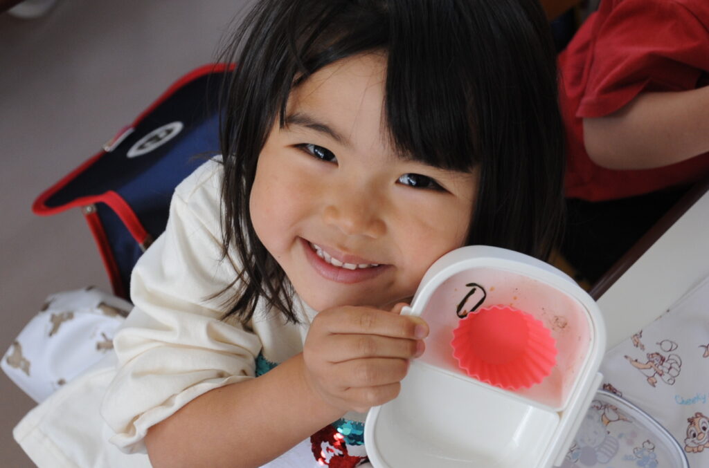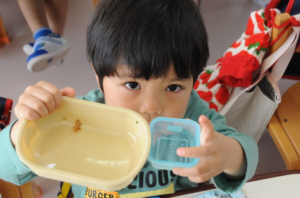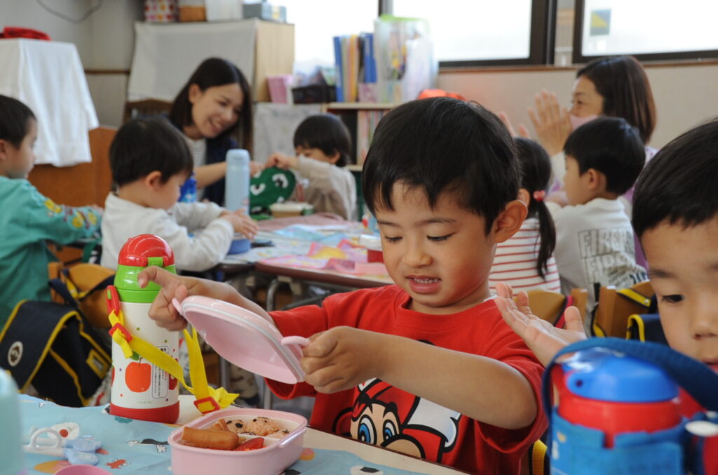 祇園幼稚園は、火、水、木がおうちの方の愛情弁当です。お弁当をつくるのは大変でしょうが、どの子も喜んで食べています。おうちの方はこの1年間、完食したお弁当箱を見るのを楽しみに、愛情たっぷりのお弁当をがんばって作ってください。よろしくお願いしますね。
