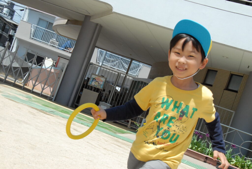 年長さんの外遊びは、クラス対抗のリレーです。前のランナーに追いつけ、追い越せで全力で走ります。どの子も爽やかな汗をかきながら、みんなで勝利に向かって走りきりました!!